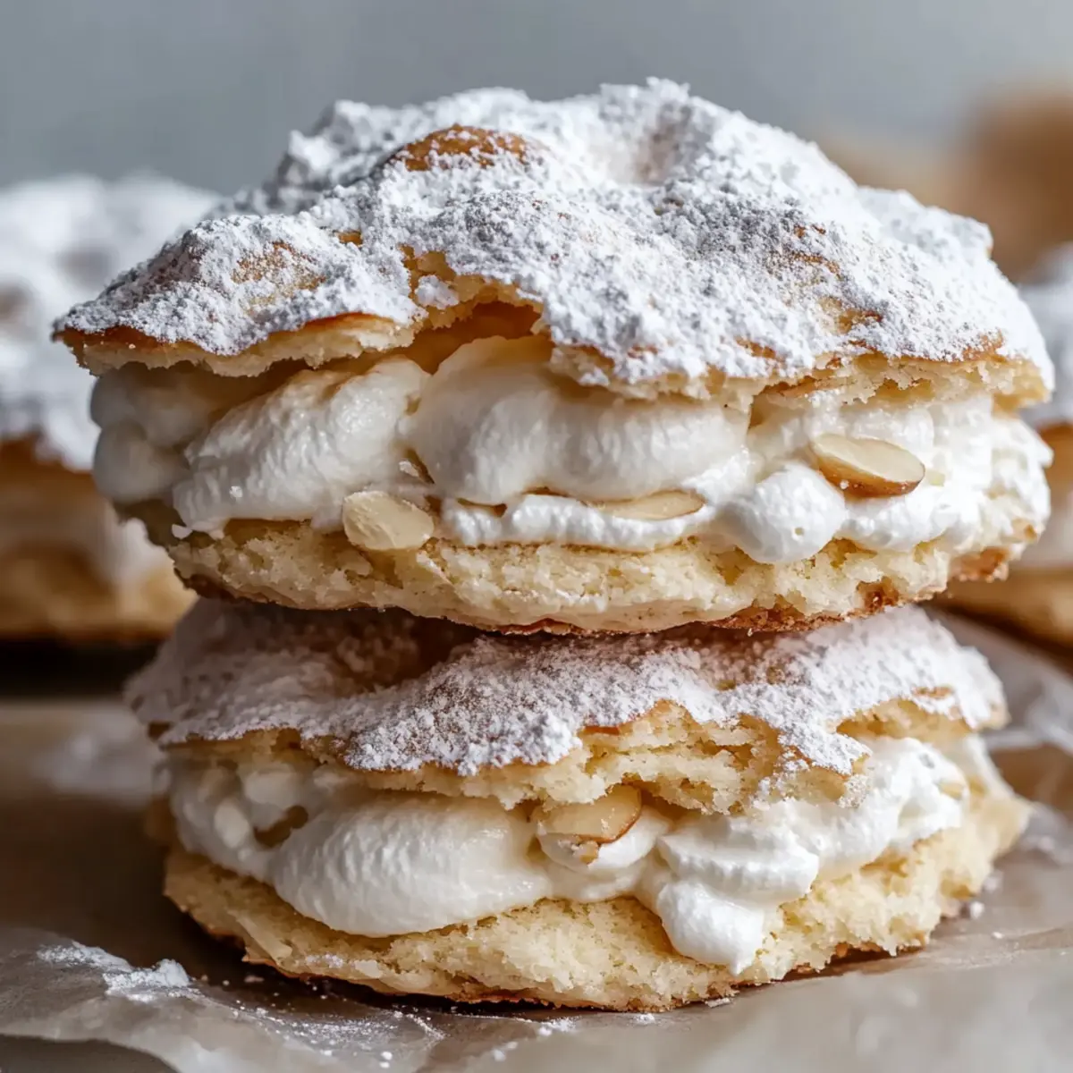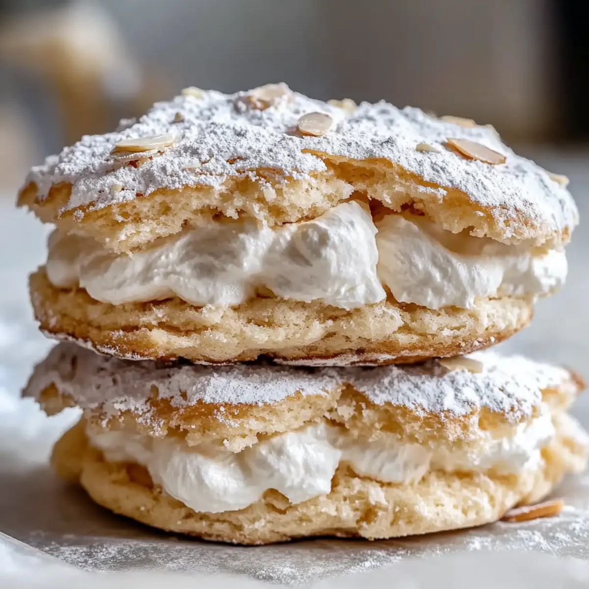 Before serving, dust the assembled cookies with powdered sugar and sprinkle extra sliced almonds on top for a lovely presentation. These finishing touches enhance the visual appeal and provide enticing flavor bursts, making your Almond Dacquoise Cream Clouds even more irresistible and ready to enjoy.