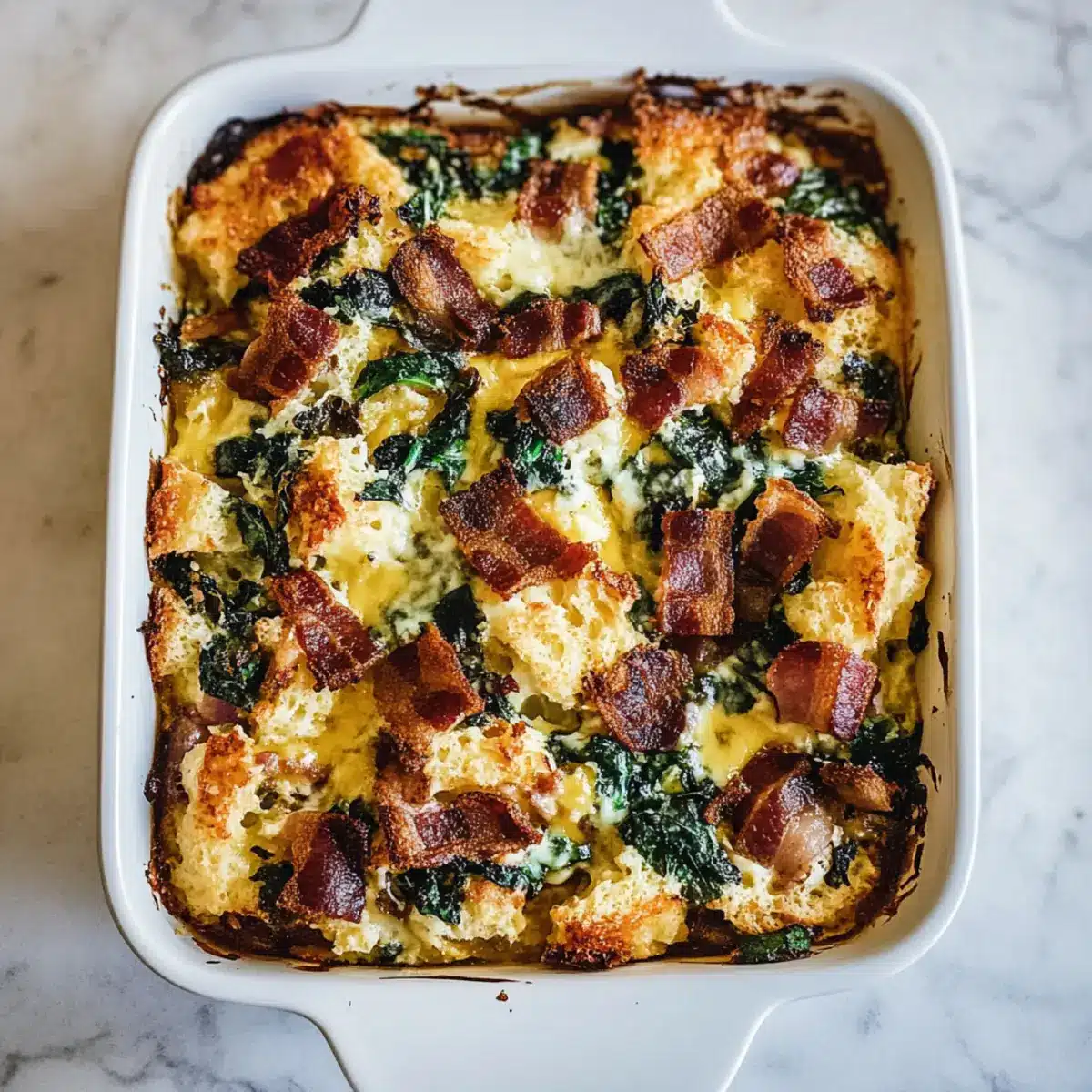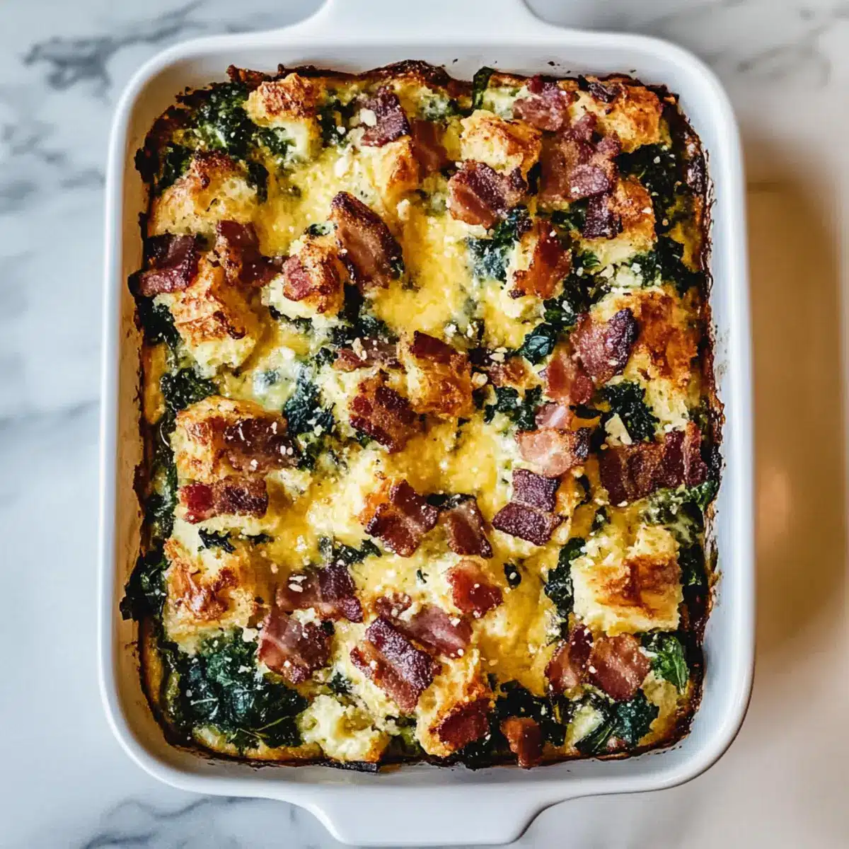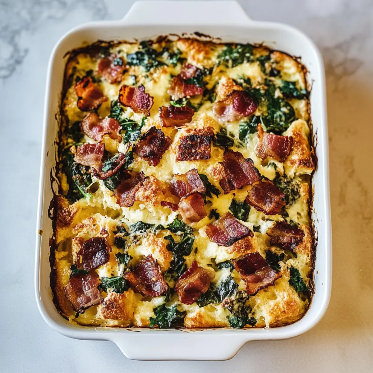 Preheat your oven to 375°F. Before baking, allow the strata to sit at room temperature for about 30 minutes for even cooking. Meanwhile, sprinkle the remaining cheese and crumbled bacon over the top to create a deliciously crispy crust as it bakes.