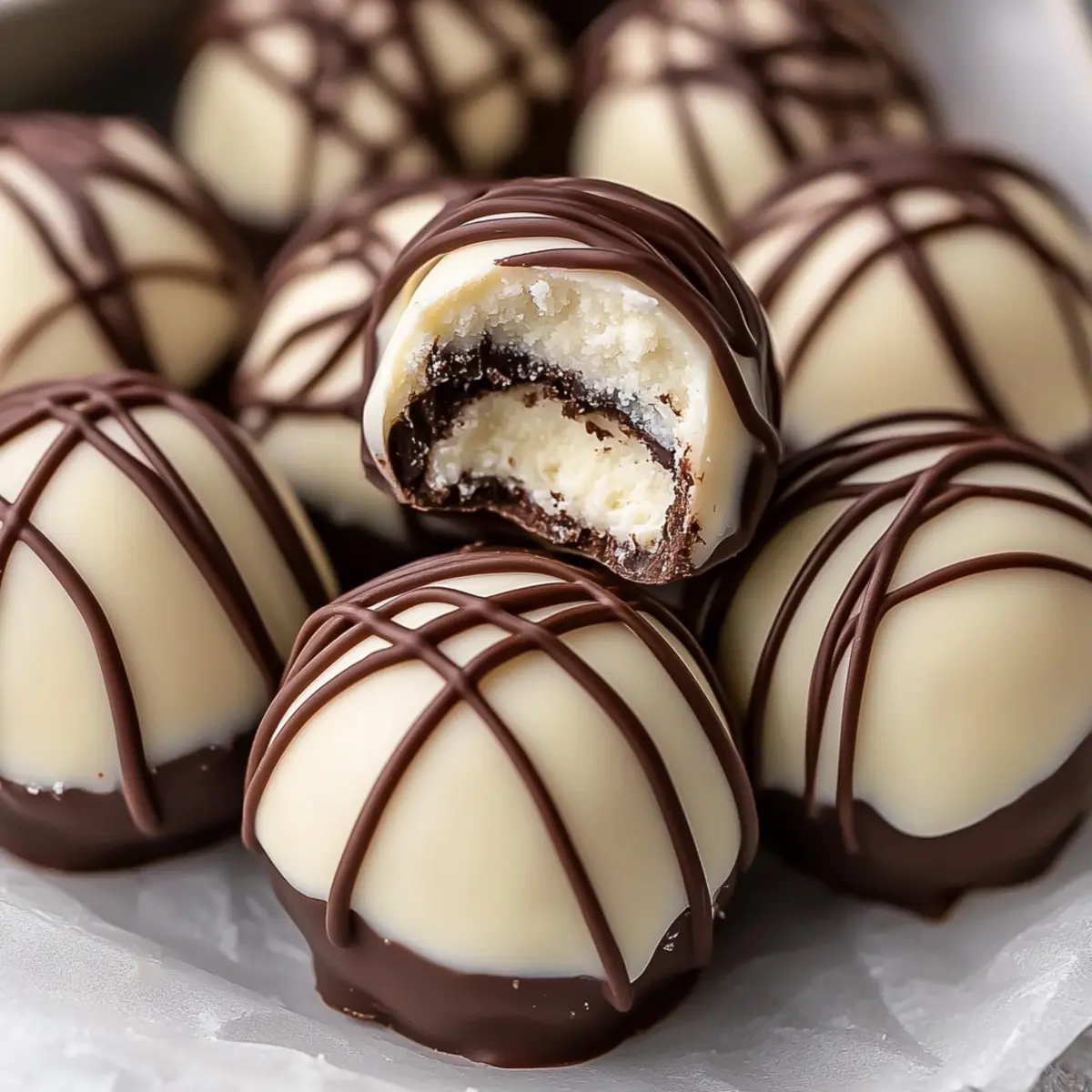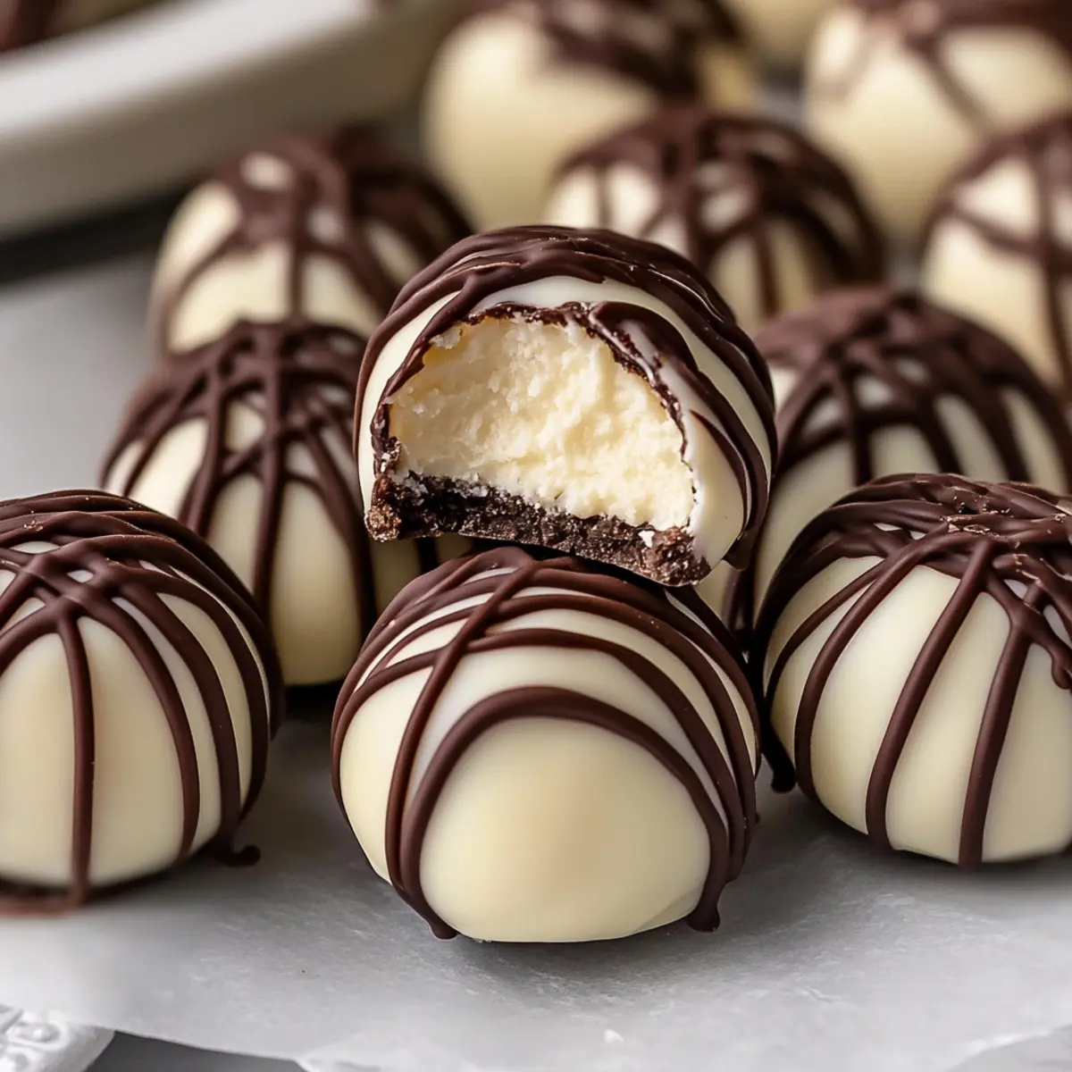 - Drizzle the melted dark chocolate over each cheesecake ball in a decorative pattern. Return to the fridge for 30 minutes to set.