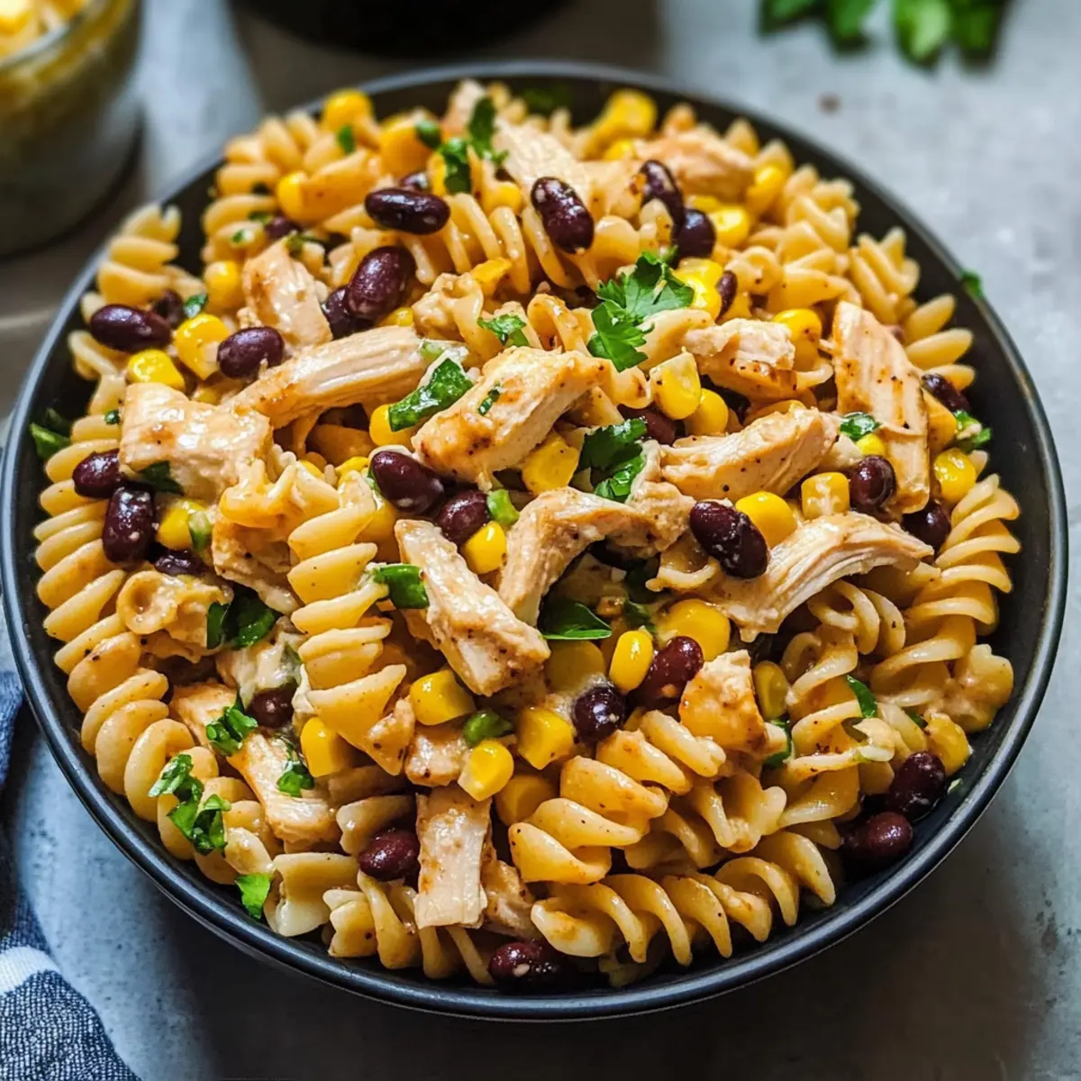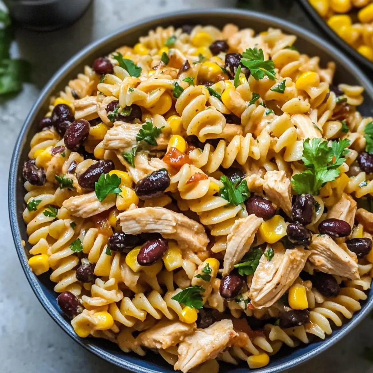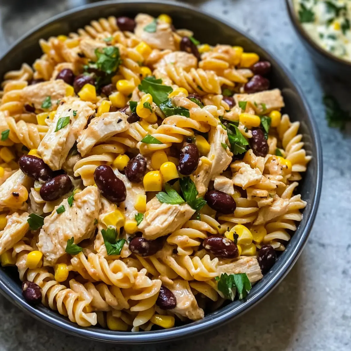 - Combine the Salad Ingredients: In a mixing bowl, add the cooled pasta, chicken, black beans, corn, onion, celery, and cilantro. Mix gently.