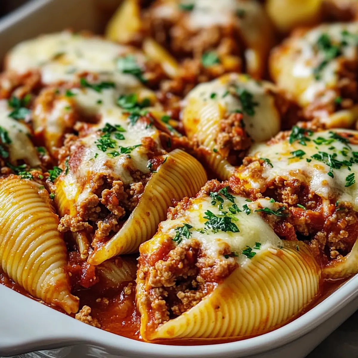 Once baked, remove the dish from the oven and allow it to stand for 5-10 minutes before serving. This resting period helps the filling set and makes it easier to serve. As the aroma fills your kitchen, cut into the Beef Stuffed Shells and enjoy each mouthful of cheesy, hearty goodness surrounded by luscious marinara—a comforting meal perfect for any occasion!