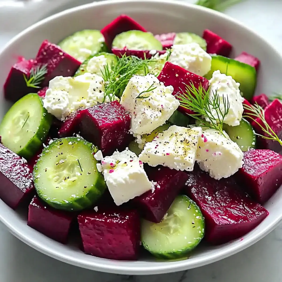 Vibrance, this Beet Feta Salad bursts with color, making it a stunning centerpiece for any meal. Quick and easy, it assembles in no time, perfect for busy cooks seeking a nutritious option. Fresh ingredients elevate your dishes, and the combination of crunchy cucumbers, creamy feta, and aromatic dill creates a unique flavor profile. Versatile enough for meal prep, it holds up beautifully in the fridge, unlike many salads. Delicious pairings with grilled chicken or Mediterranean dishes make this salad a crowd-pleaser that transforms everyday dining into a celebration.