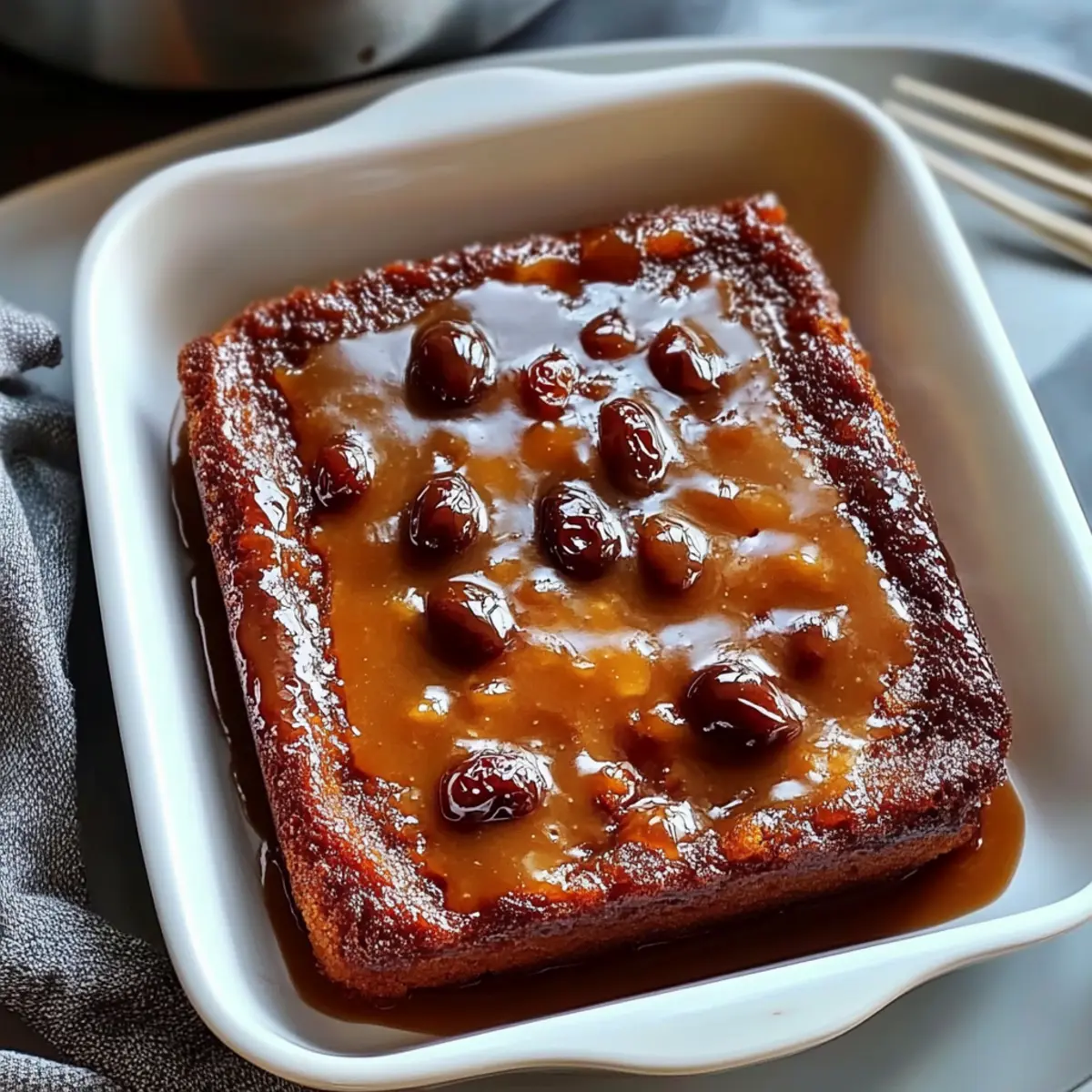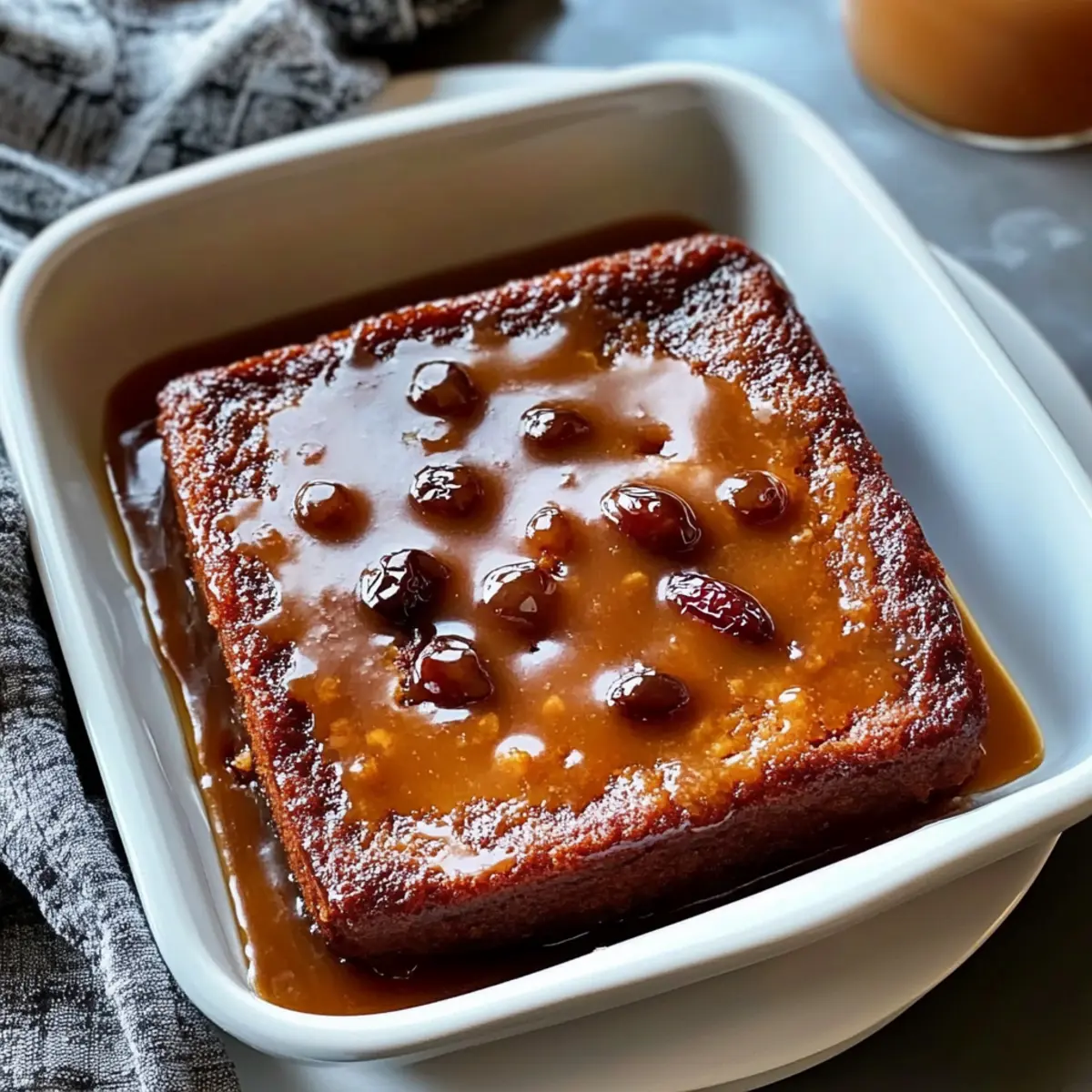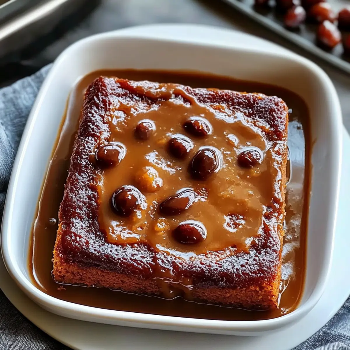 - Invert the cake onto a plate, poke holes in the top, and pour half the toffee sauce over it. Reserve the rest for serving.