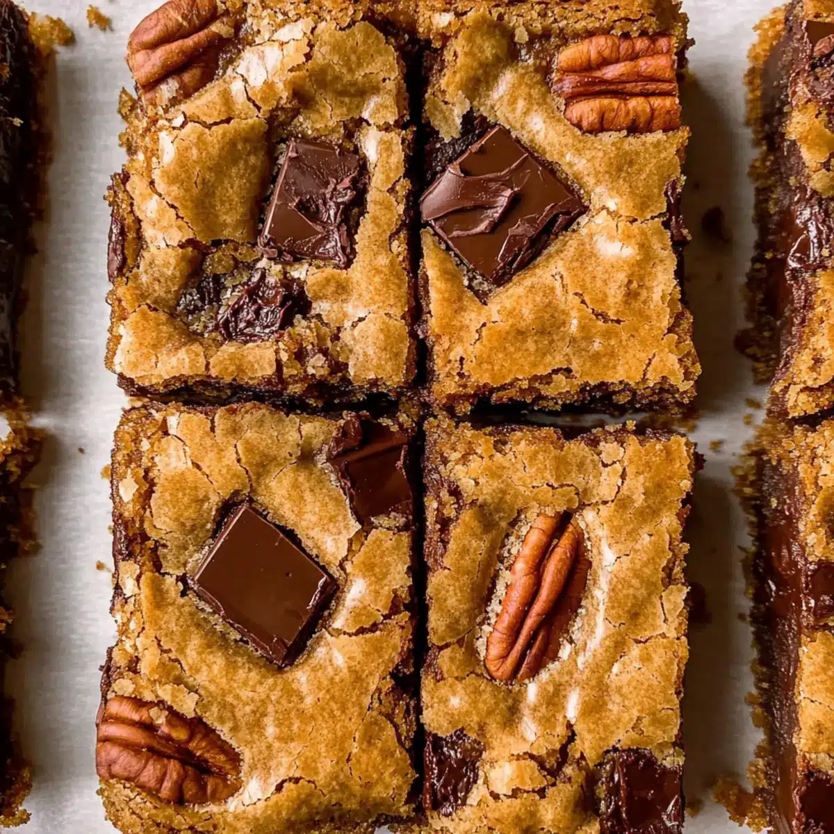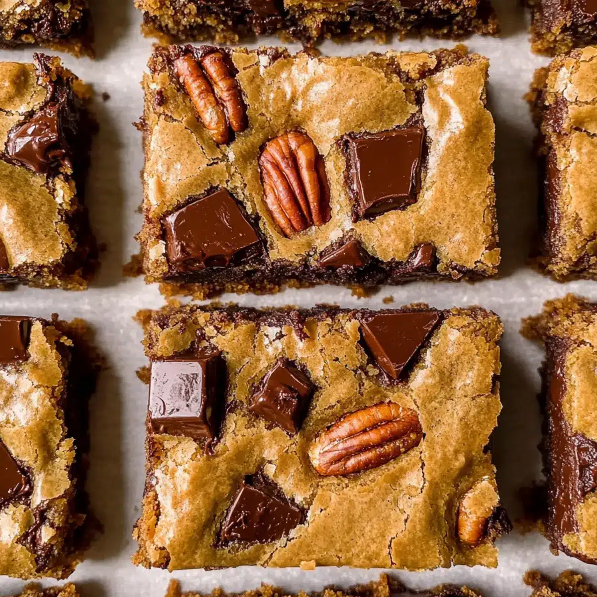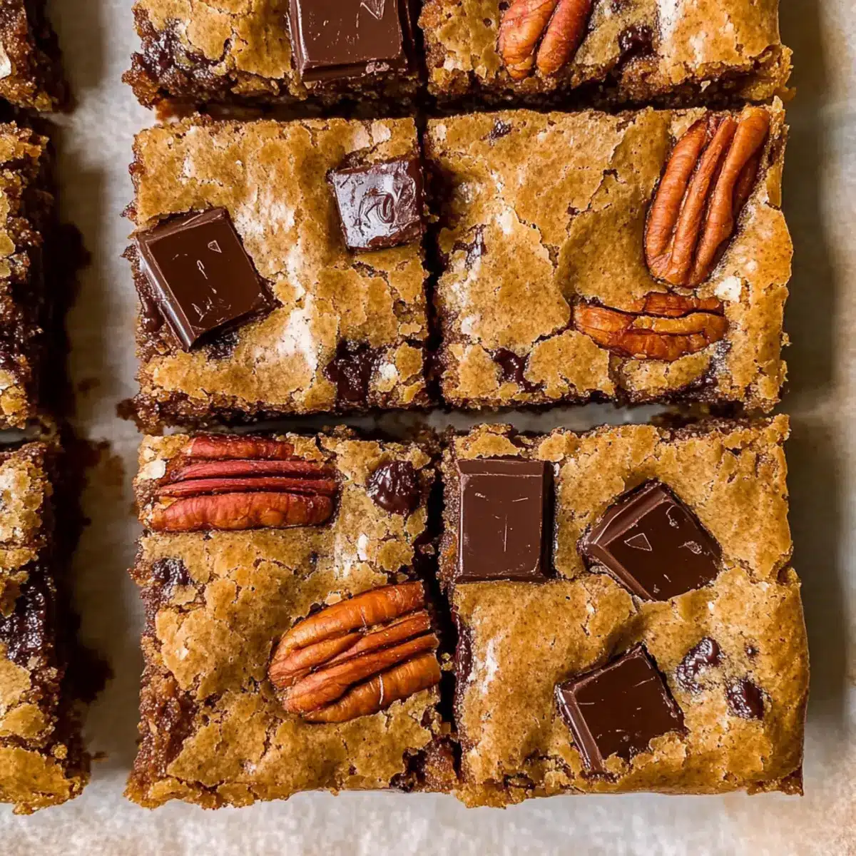 Texture Delight: The chewy blondies are punctuated with gooey chocolate chunks and crunchy pecans, creating a perfect harmony of textures.