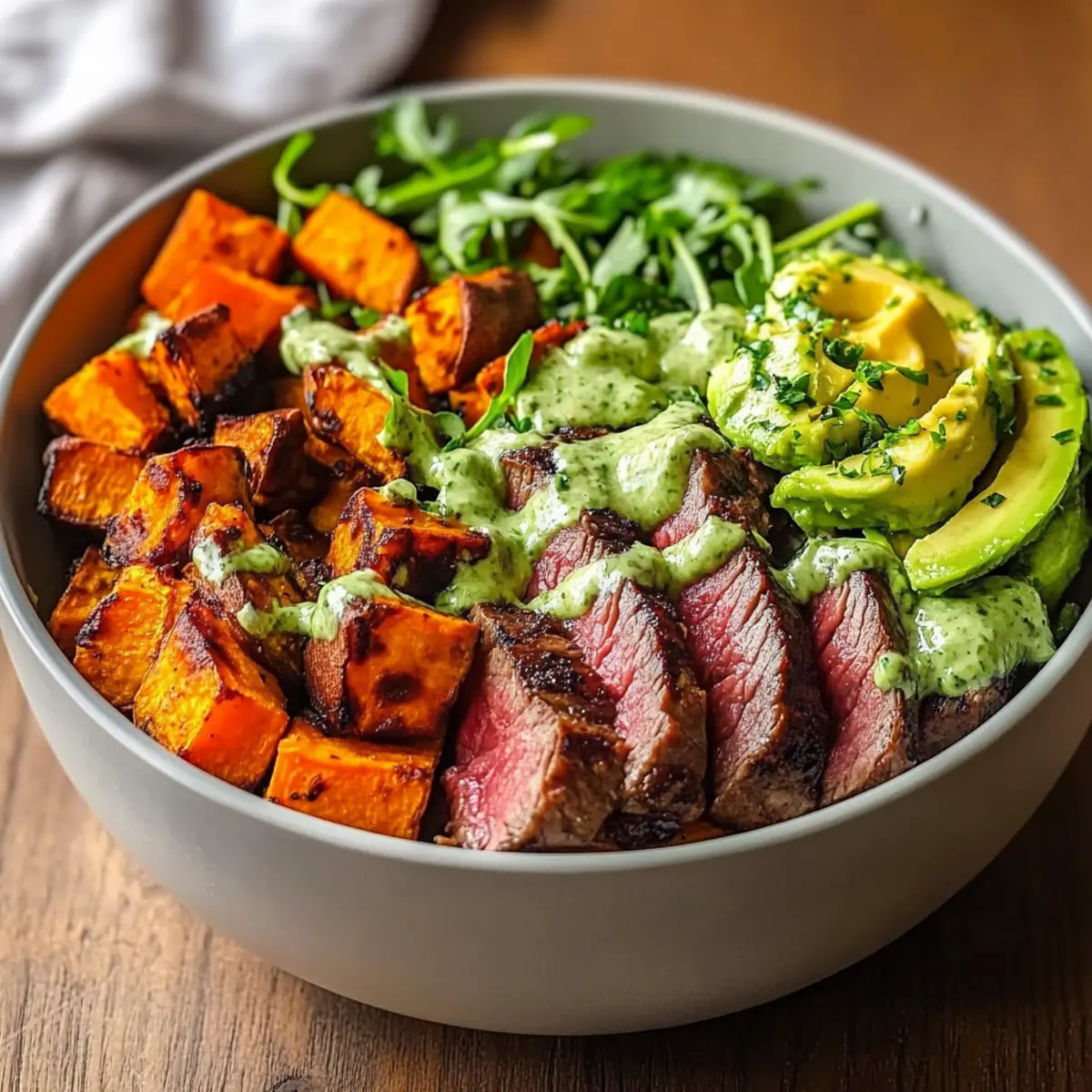 Steak and Sweet Potato Bowls with Creamy Avocado Drizzle