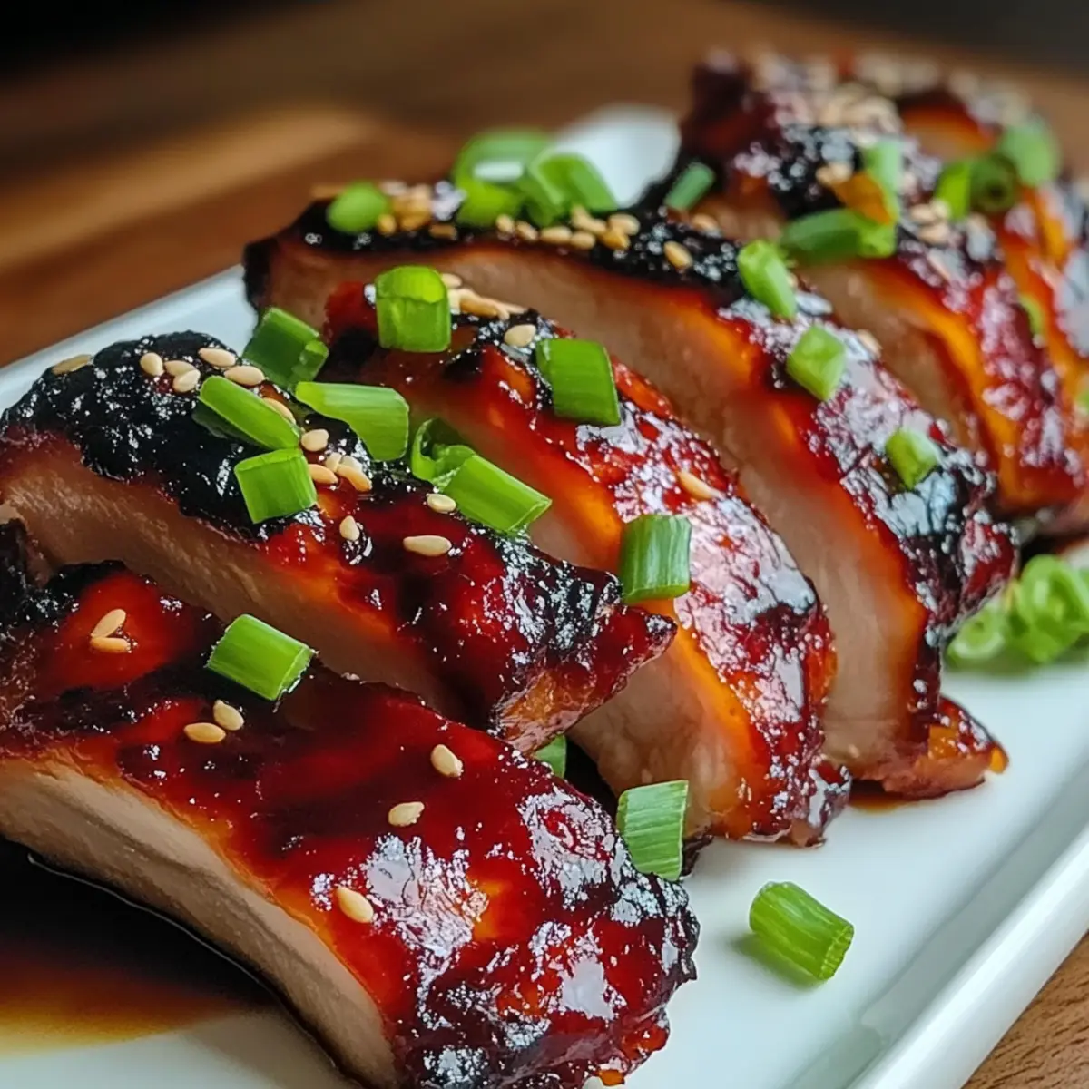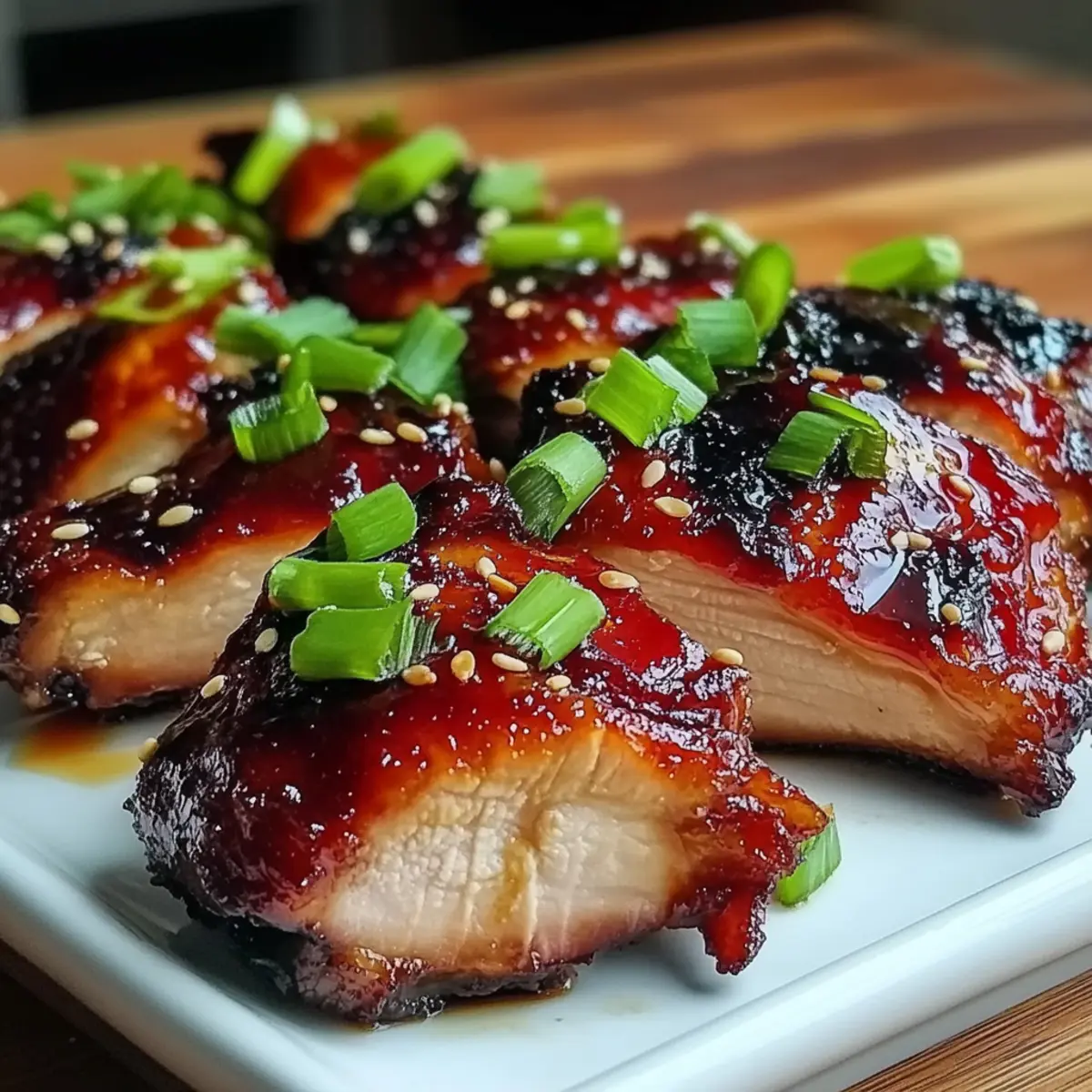 Once fully cooked, remove the Char Siu Chicken from the oven and let it rest for about 5 minutes. This resting time allows the juices to redistribute, ensuring each bite is tender and juicy. Garnish with freshly sliced green onions and a sprinkle of sesame seeds for an eye-catching presentation before serving.