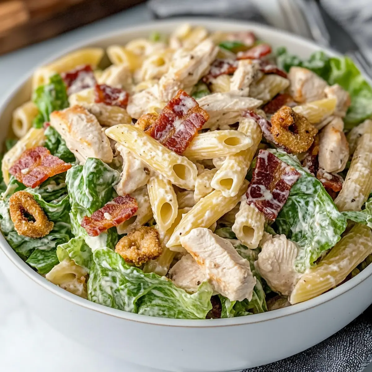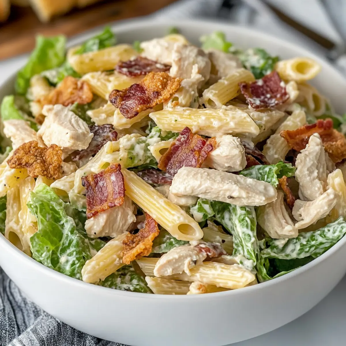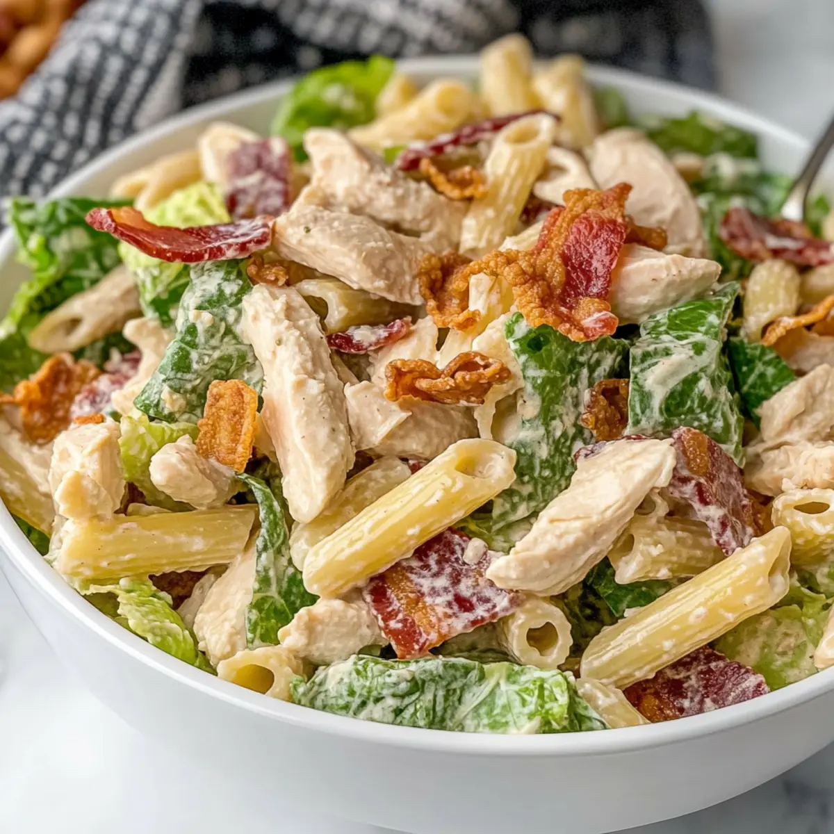 Savory Chicken Caesar Pasta Salad with Crispy Bacon Delight