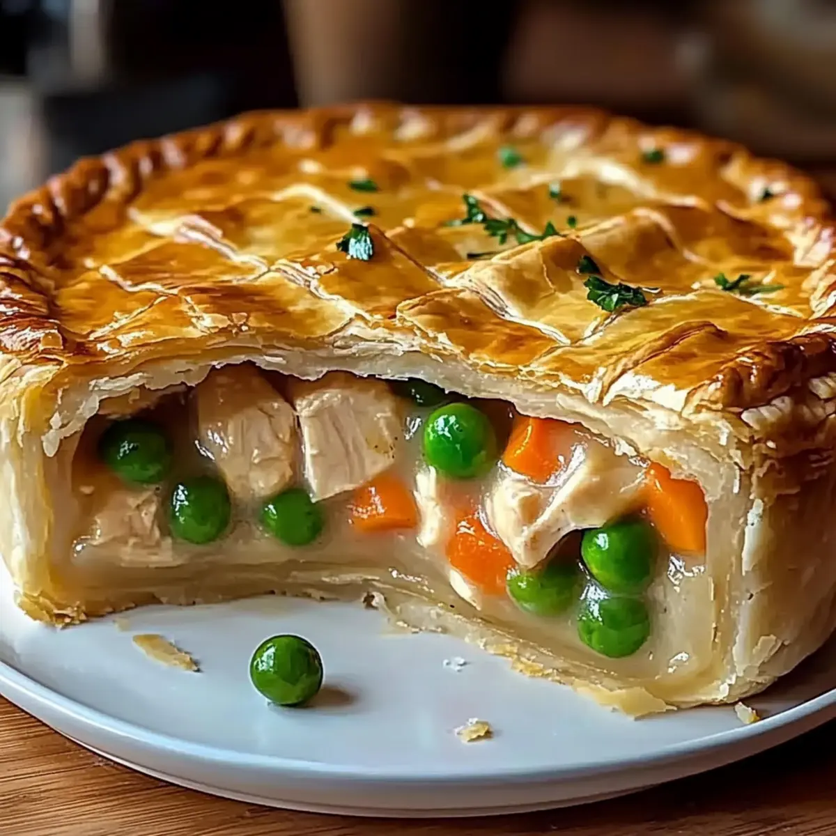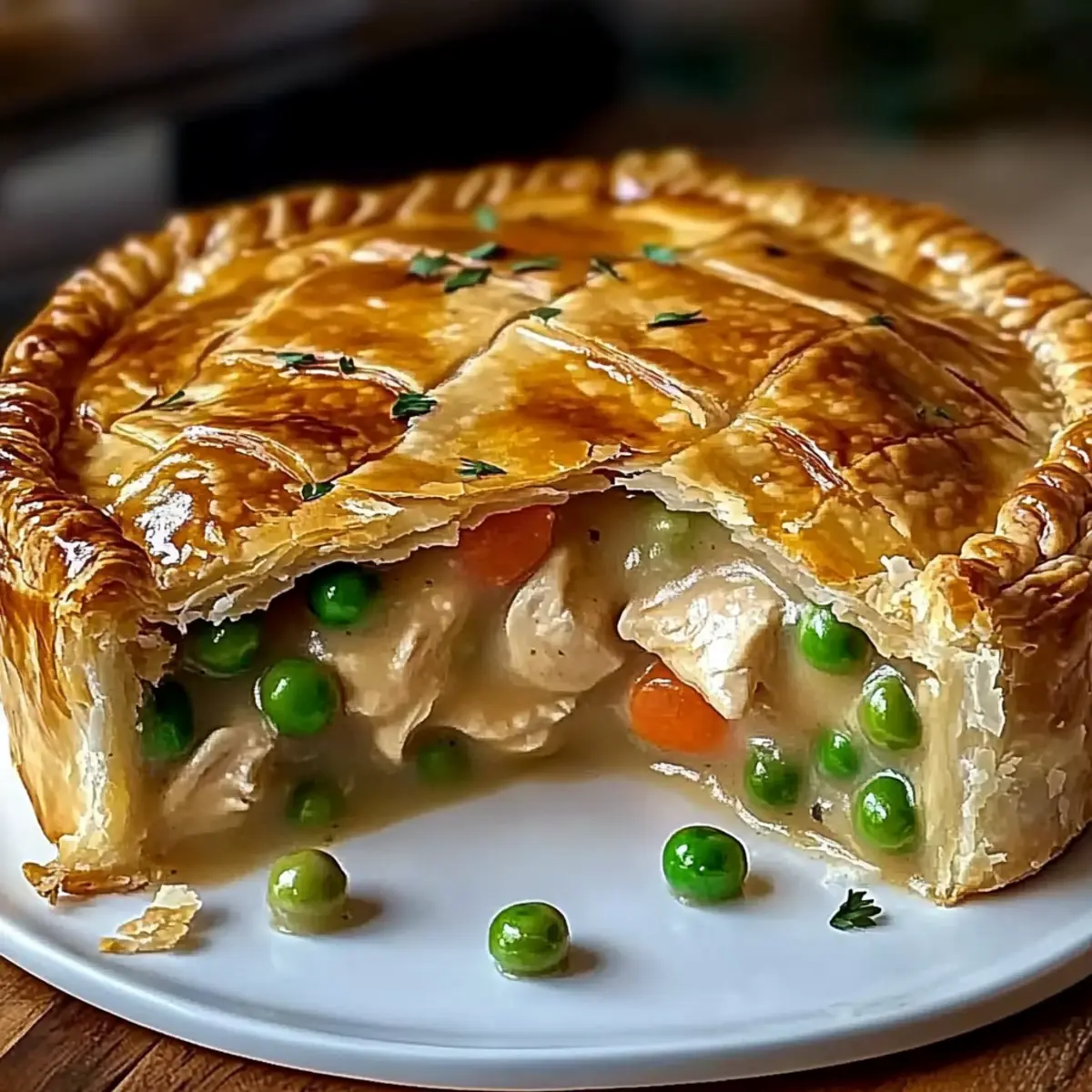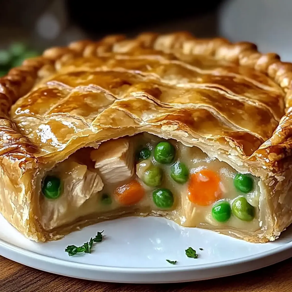 Once baked, remove the Chicken Pot Pie from the oven and let it rest for 10-15 minutes. This resting period allows the filling to set slightly, making it easier to serve. Enjoy the comforting aroma as you prepare to slice into this delicious homemade dish!