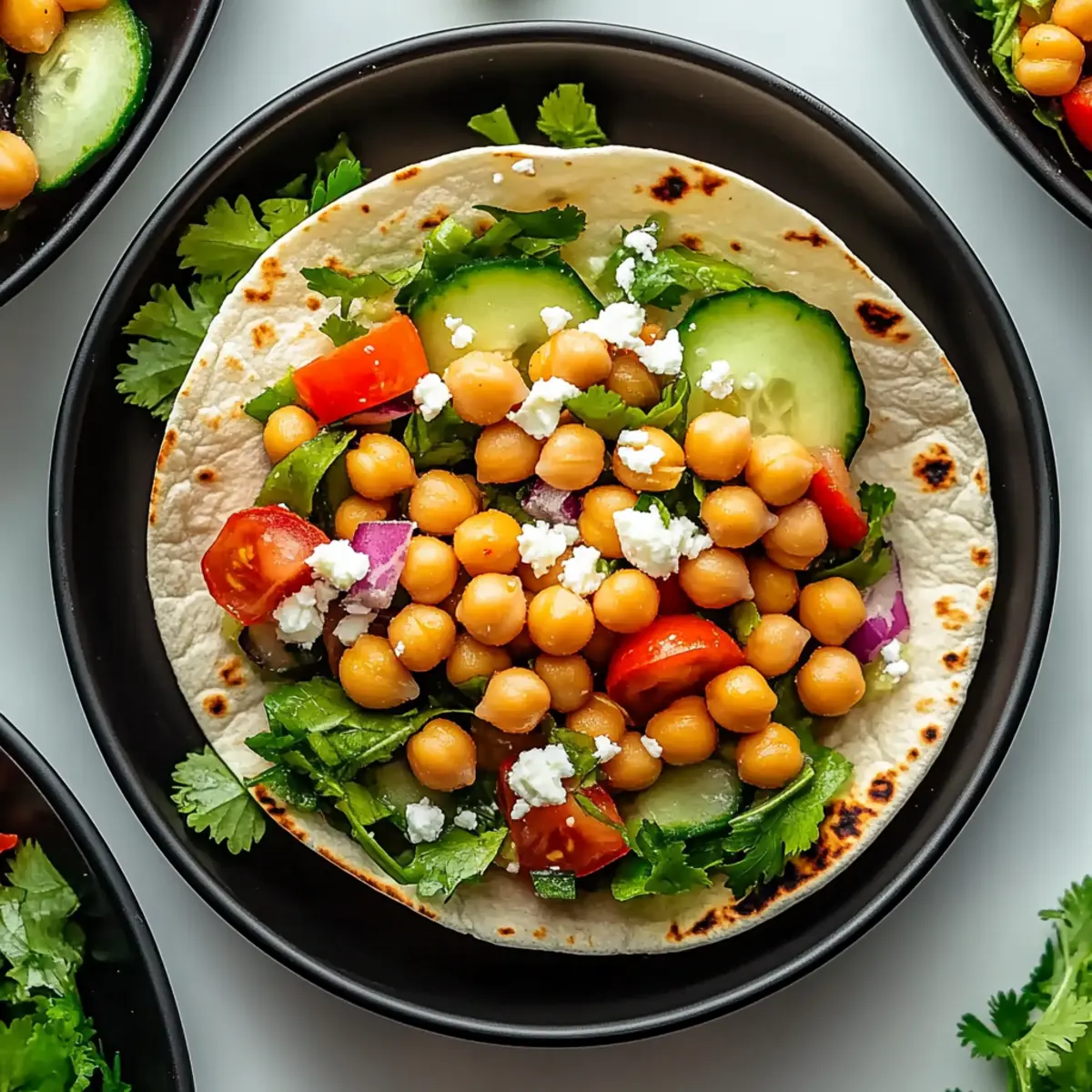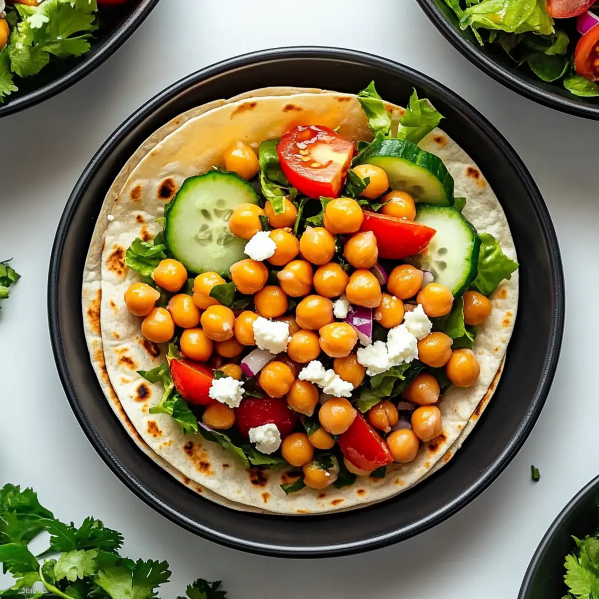 Sprinkle crumbled feta cheese over the top of the filling in each wrap. The creamy saltiness of the feta complements the chickpeas wonderfully and adds an extra layer of flavor to your wraps. Feel free to adjust the amount depending on your preferences or use a dairy-free feta for a vegan twist.