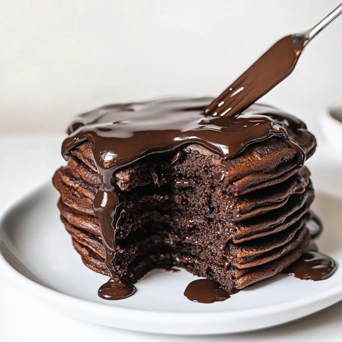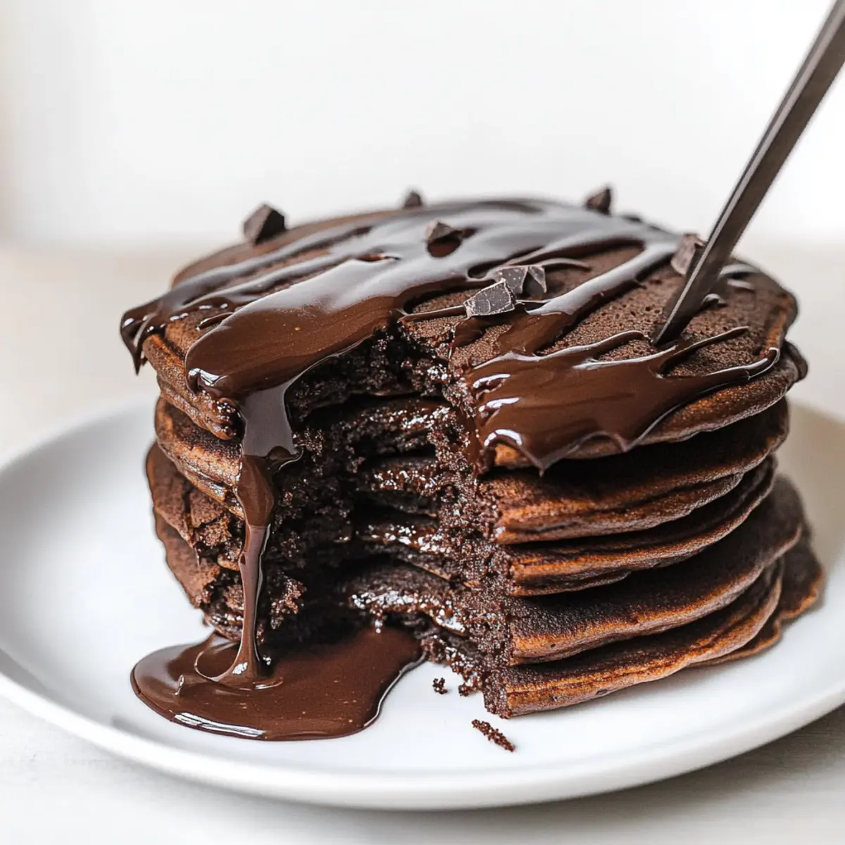 - Serve the pancakes stacked, drizzled with chocolate ganache, and optionally topped with berries or ice cream.