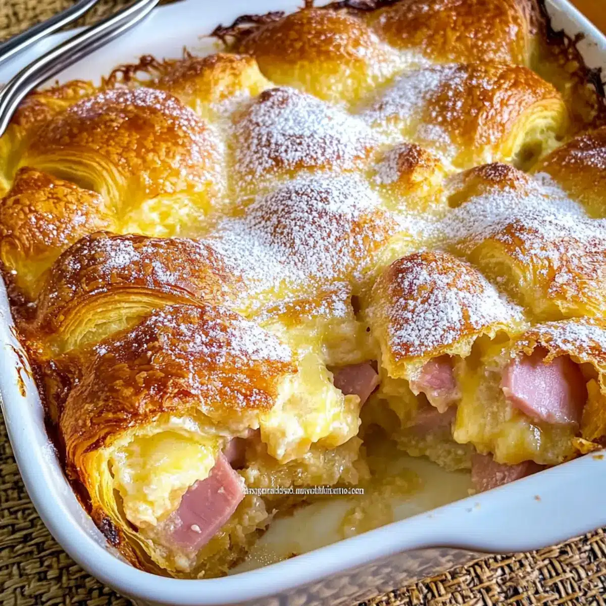 Once baked, remove the casserole from the oven and allow it to rest for about 5 minutes. This helps it set up nicely for serving. Before diving in, sprinkle with powdered sugar for a festive touch, enhancing both flavor and presentation, making your Ham and Cheese Croissant Breakfast Casserole truly special.