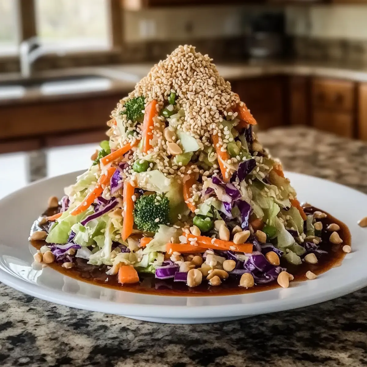 Finally, sprinkle toasted sesame seeds and chopped peanuts over the slaw for garnish. Toss everything together gently one last time to blend in the toppings. Your Crunchy Asian Cabbage Slaw is now ready to serve! It can be enjoyed immediately or refrigerated for a couple of hours to enhance the flavors even further.