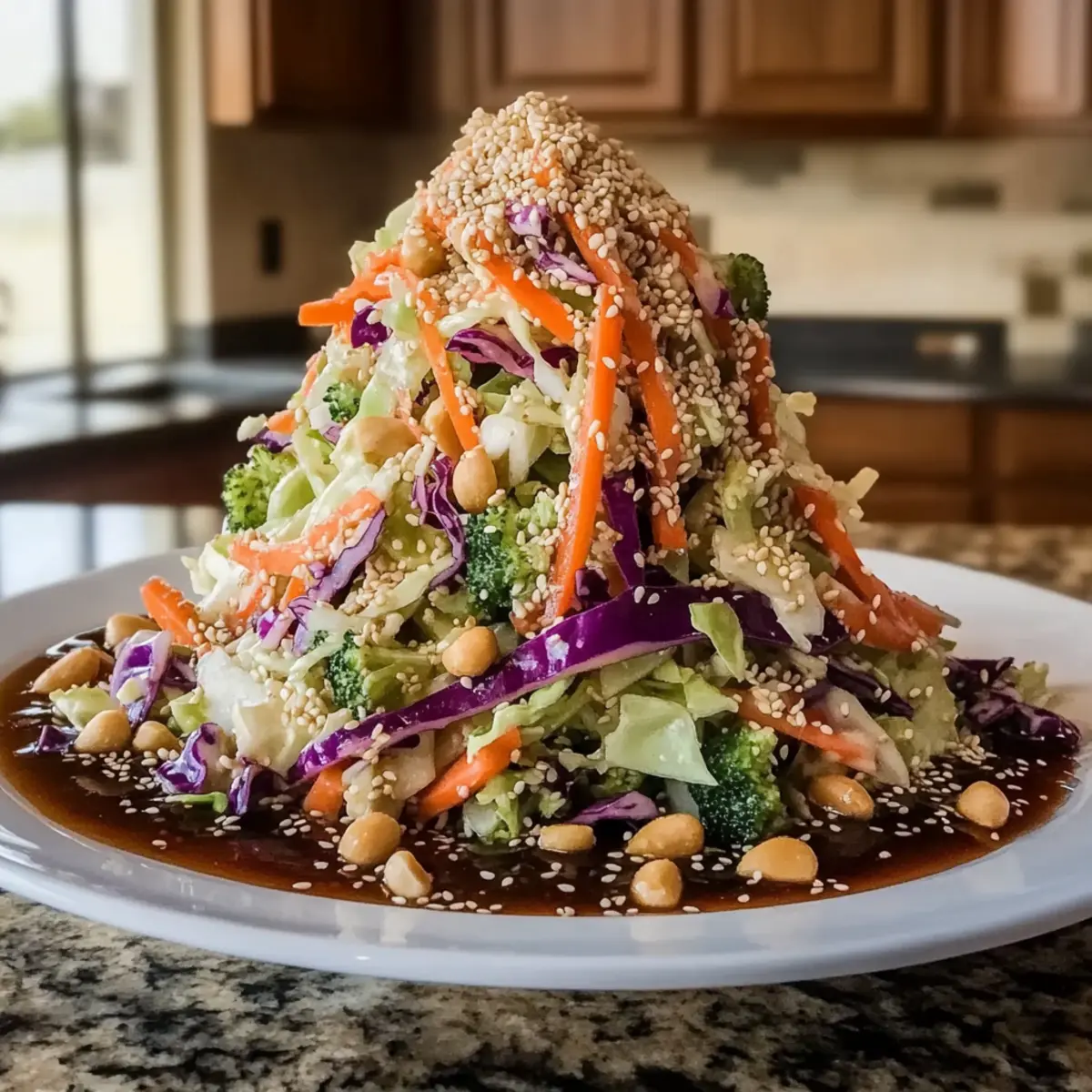 - Sprinkle sesame seeds and chopped peanuts over the slaw. Toss gently one last time and serve.