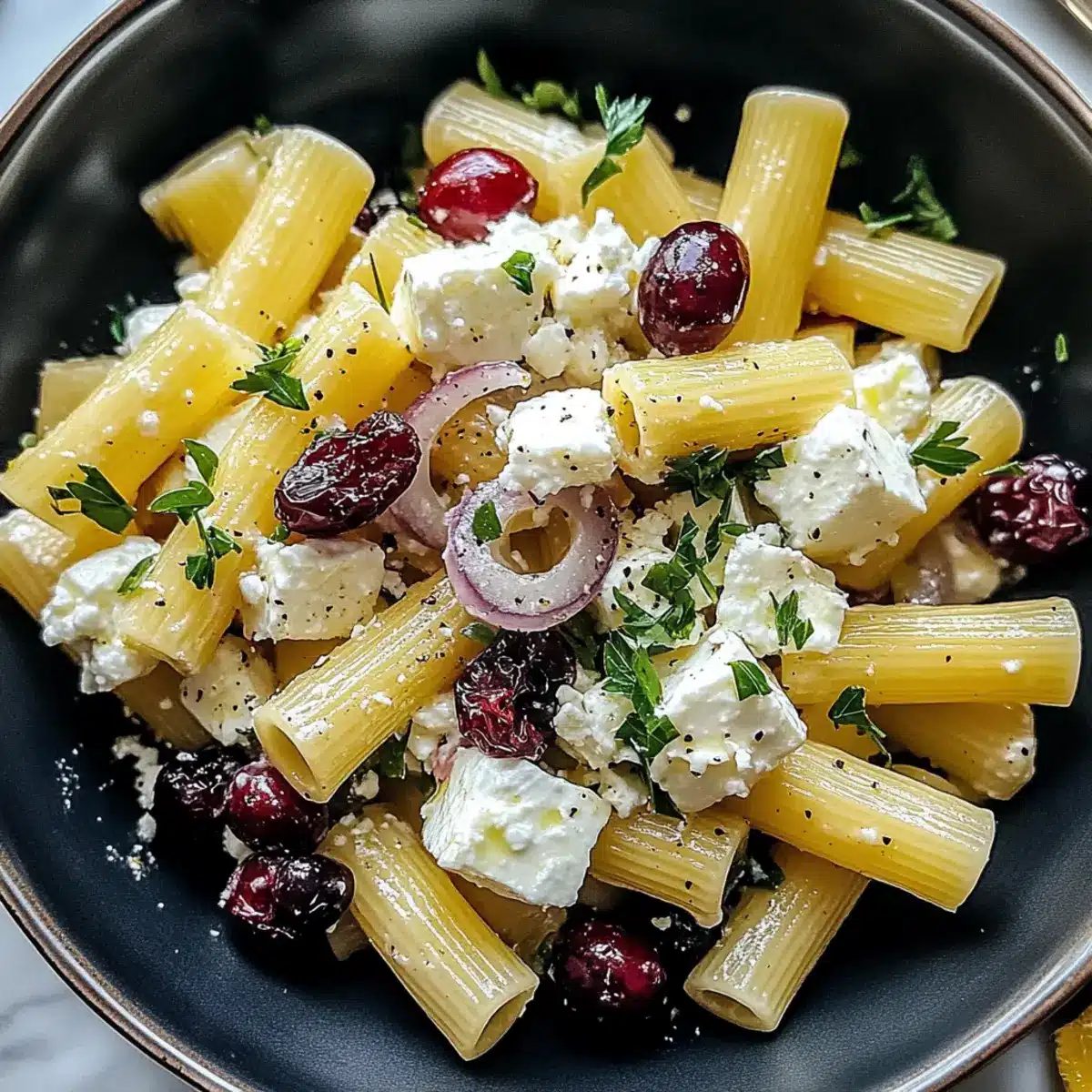 Flavorful Journey: Each bite of this Feta & Cranberry Rigatoni Salad combines creamy feta, sweet cranberries, and a zesty lemon vinaigrette for an explosion of taste.