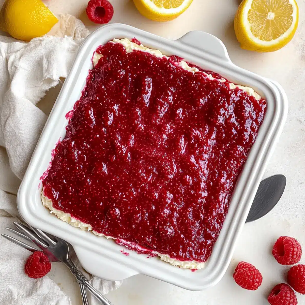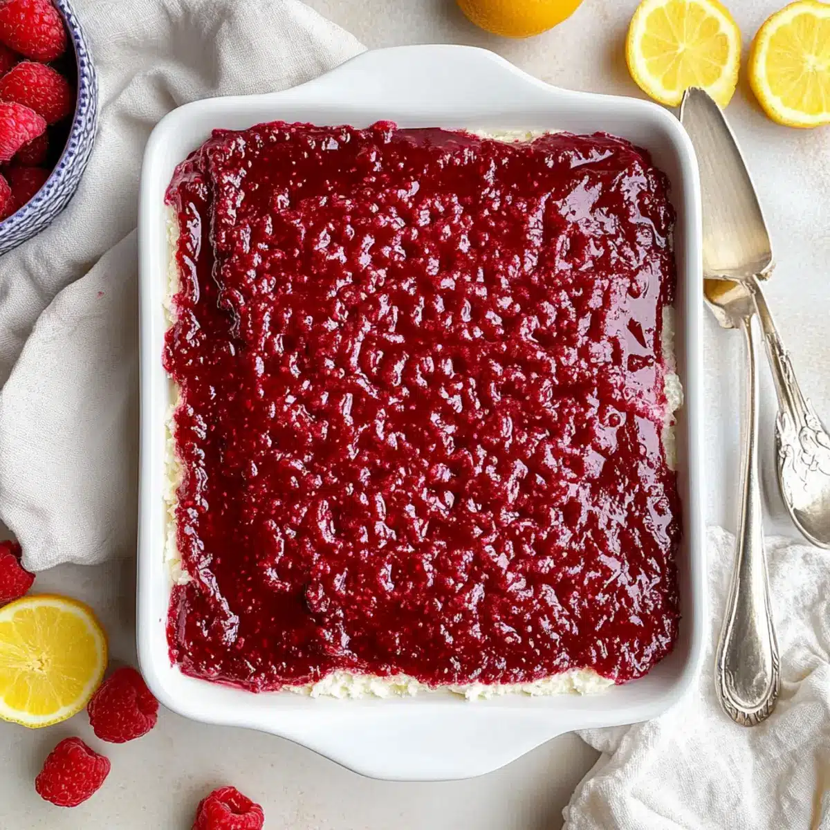 - Before serving, top with remaining raspberry jam, fresh raspberries, and lemon slices. Cut into squares and serve chilled.