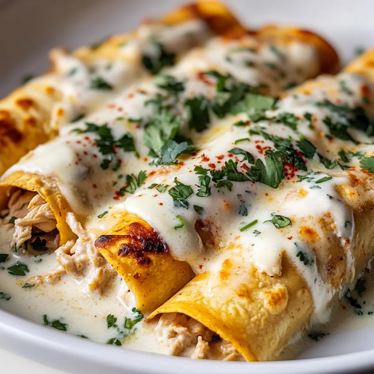 Once all enchiladas are in the baking dish, pour the remaining white sauce evenly over the top. Sprinkle the rest of the shredded cheese across the surface, adding a savory layer that will melt beautifully as it bakes.