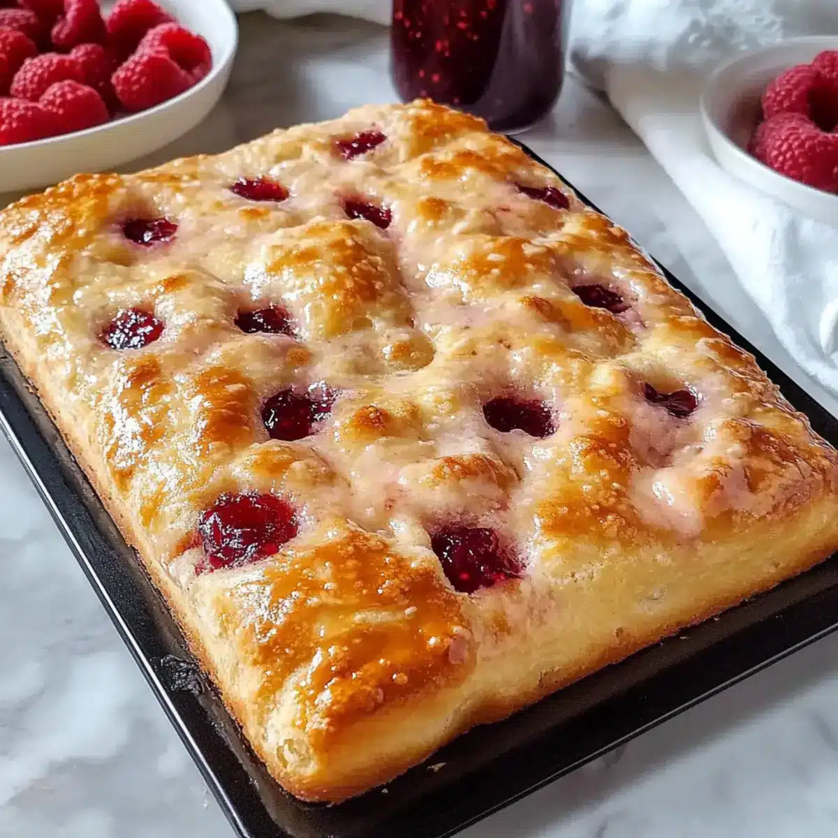 - Preheat oven to 425°F (220°C). Poke deep dimples in the dough and spread raspberry preserves into each dimple.