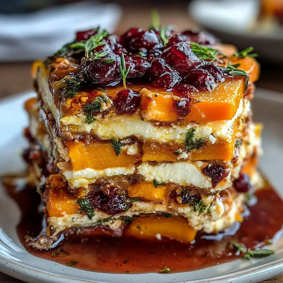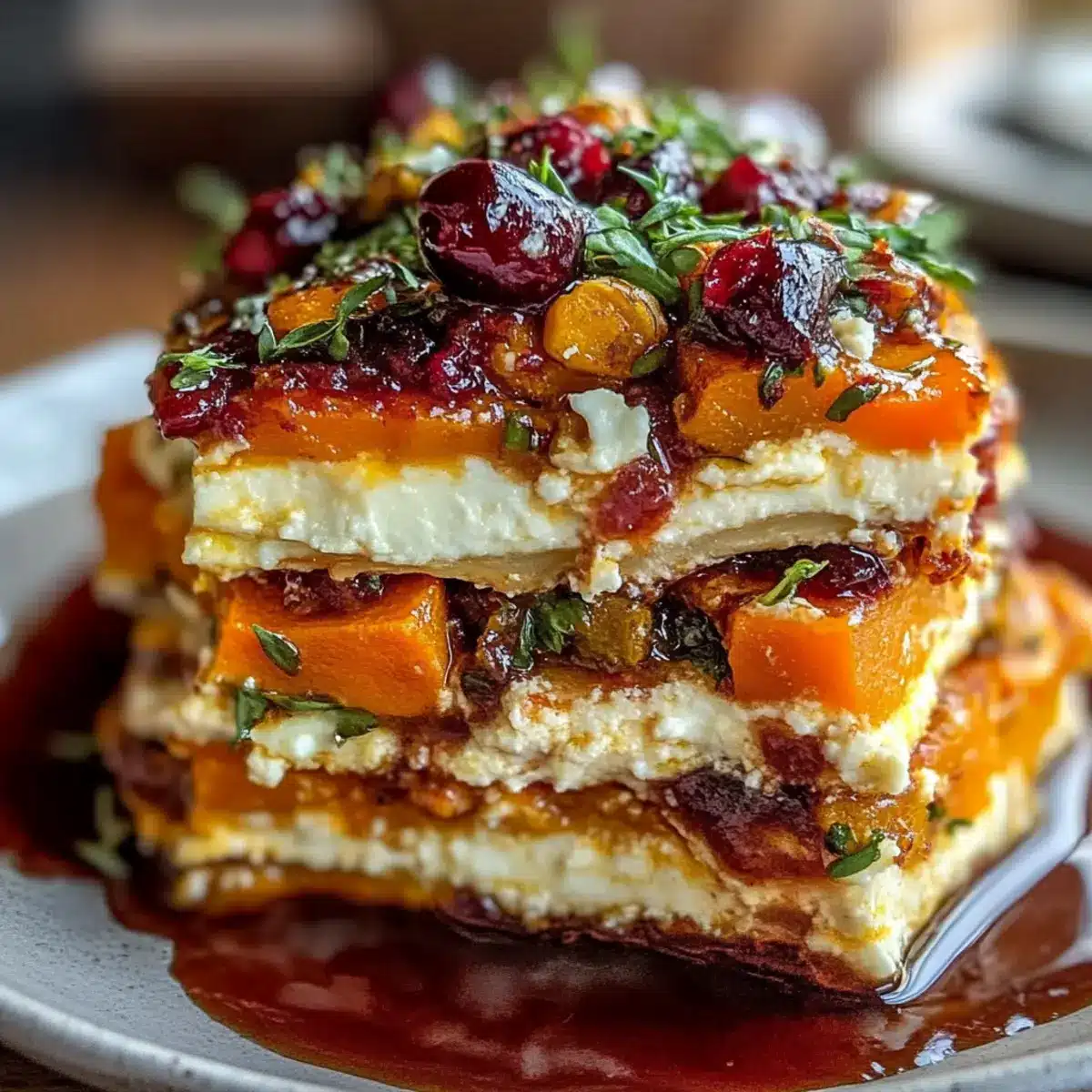 Drizzle a generous amount of cranberry-honey glaze over the top layer of your lasagna, ensuring even coverage to enhance both flavor and appearance. The glossy glaze will create a delightful finish, so take care to distribute it evenly across the sweet potato, butternut squash, and carrot layers below, ensuring every bite is a flavorful experience.