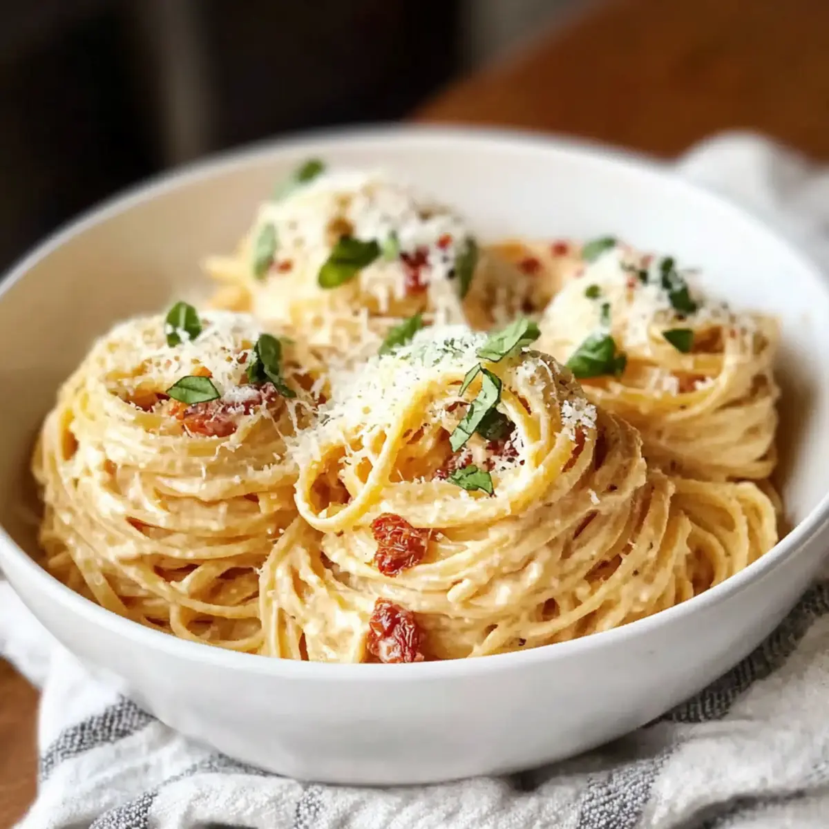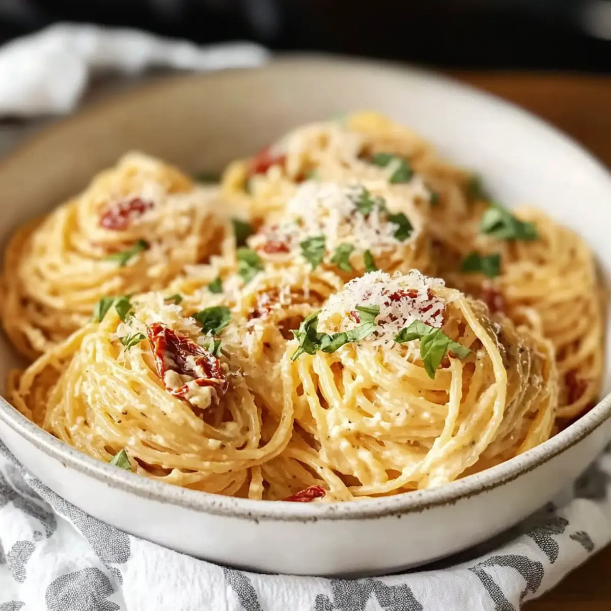 - Plate pasta and top with extra parmesan and fresh basil. Optionally, drizzle with sun-dried tomato oil before serving.
