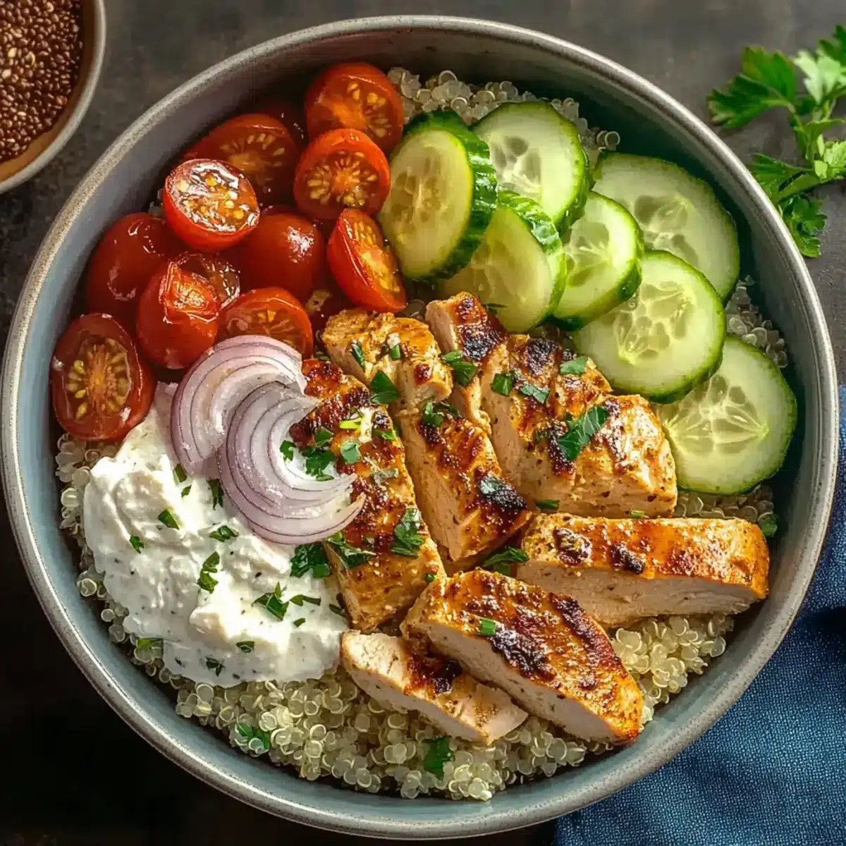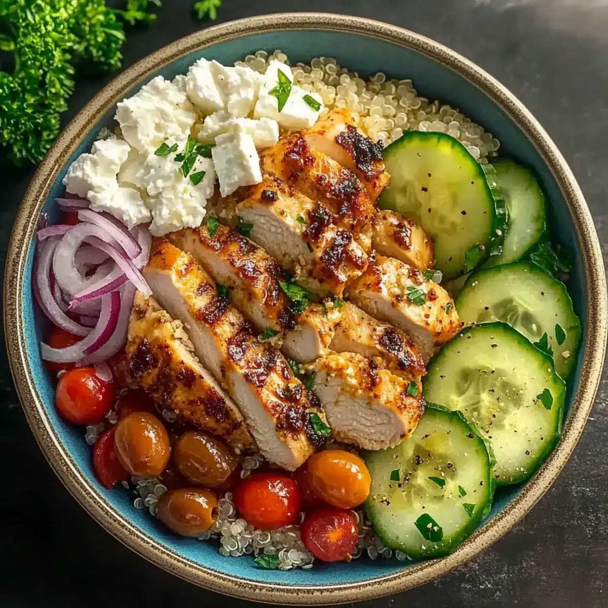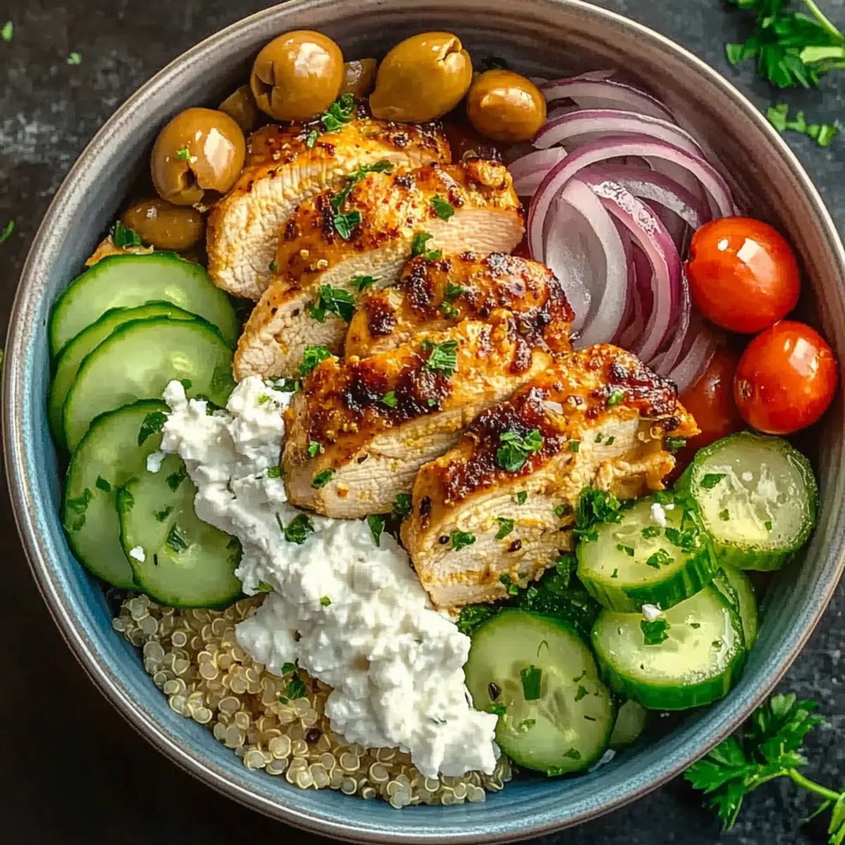 - Finally, sprinkle crumbled feta cheese over each Mediterranean Chicken Bowl, followed by a handful of freshly chopped parsley for a bright finish. This not only enhances the dish's visual appeal but adds freshness that complements the vibrant flavors. Enjoy your delicious meal that looks as great as it tastes!