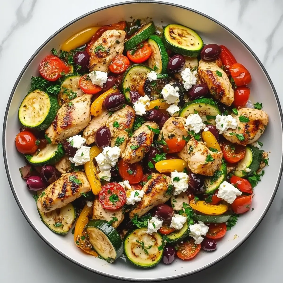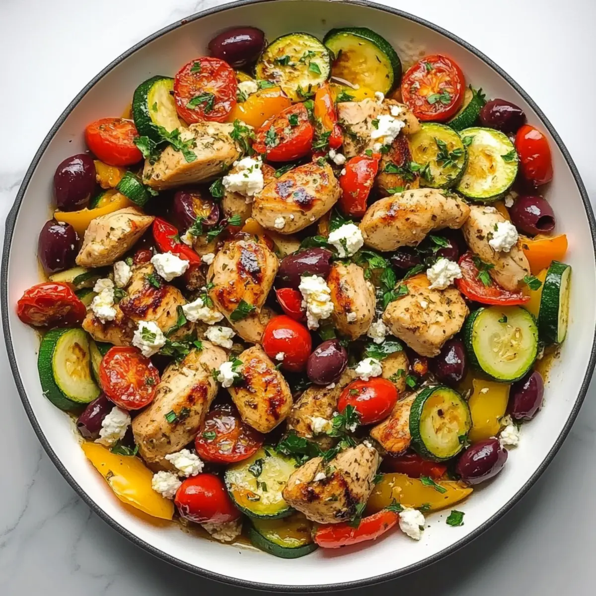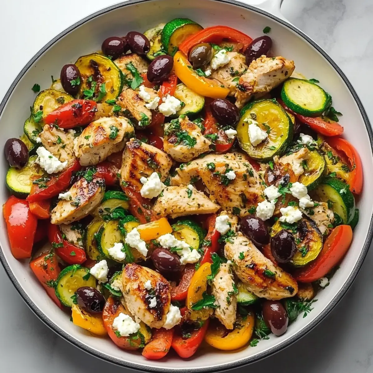 If you’re concerned about allergies, this Mediterranean Chicken Stir Fry contains chicken, olives, and dairy from feta cheese—common allergens. For a dairy-free version, simply omit the feta or substitute with a dairy-free product. Since olives can be high in sodium, rinse them before adding to lower the salt content if needed. If you’re prepping for pets, chicken is generally safe but avoid feeding the stir fry with added ingredients like garlic and onion, as they can be harmful to pets.