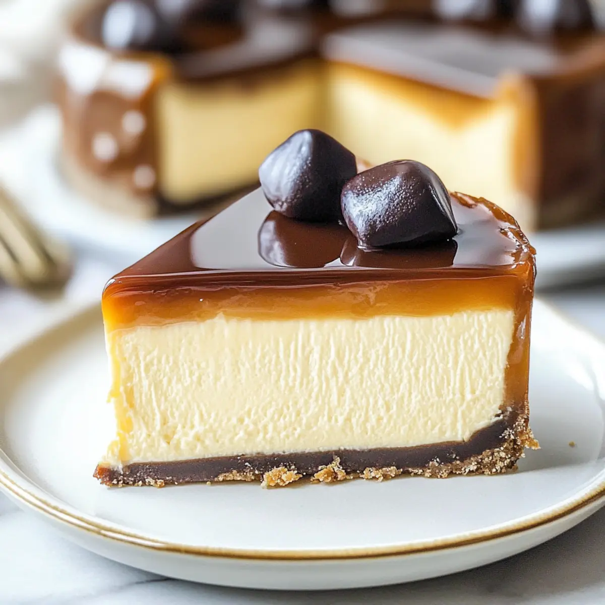 After the caramel has cooled, gently pour it over the top of the cheesecake, spreading it evenly with a spatula for a glossy finish. Return the cheesecake to the refrigerator for one more hour to set the caramel before serving. Once set, slice into pieces and watch everyone savor the decadence of this Millionaire Cheesecake.