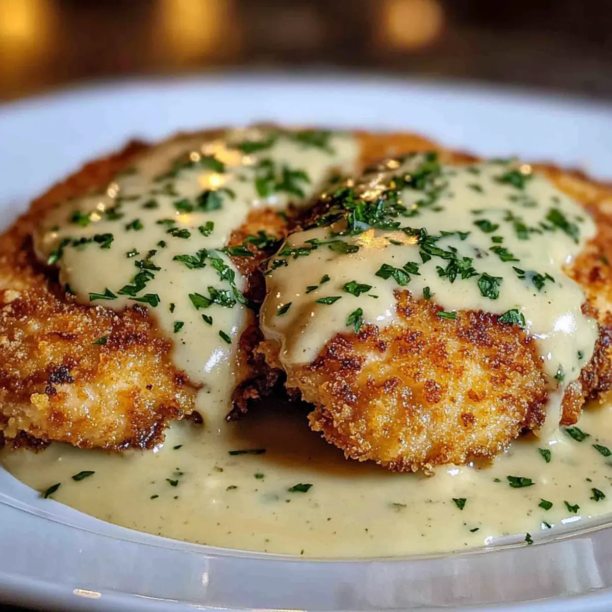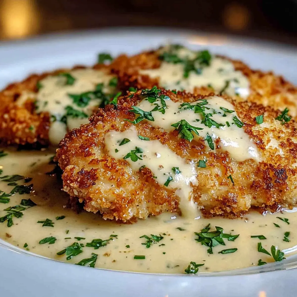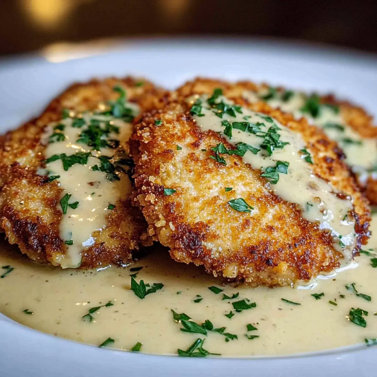 Once the sauce has thickened, stir in another ¼ cup of grated Parmesan cheese until melted and incorporated. Season the sauce with salt and pepper to taste. Then, return the crispy chicken cutlets to the skillet, nestling them in the creamy garlic sauce. Let them soak in the flavors for a minute before serving. Optionally, garnish with freshly chopped parsley or thyme for a pop of color and freshness.