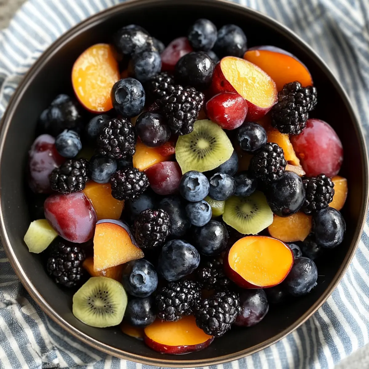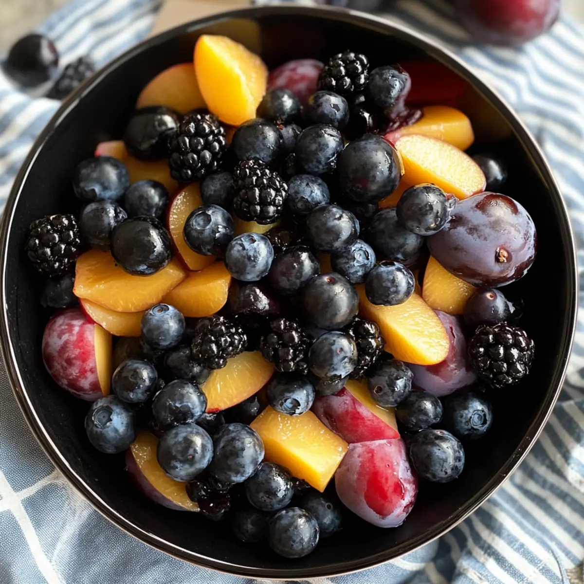 - In a large mixing bowl, combine black grapes, blueberries, blackberries, and diced plums. Toss gently.