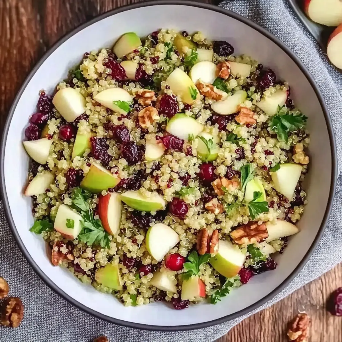 - In a large bowl, combine fluffed quinoa, diced apples, chopped celery, fresh parsley, and candied walnuts. Pour vinaigrette over and toss until coated.