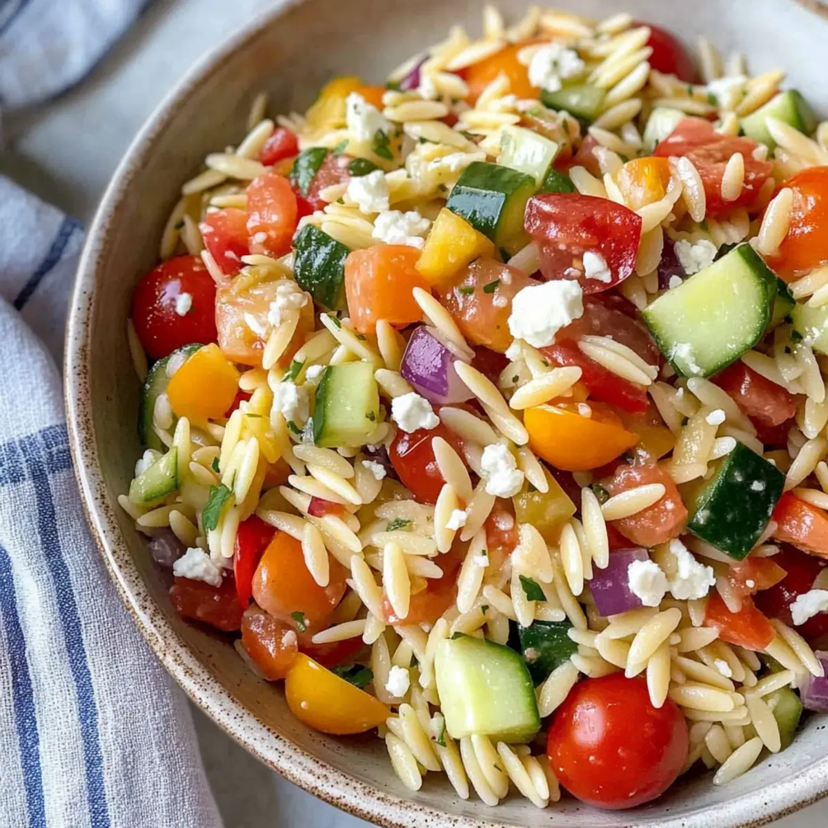 - Step 4: Combine Ingredients - In a bowl with vegetables, add cooled orzo and crumbled feta. Mix gently.