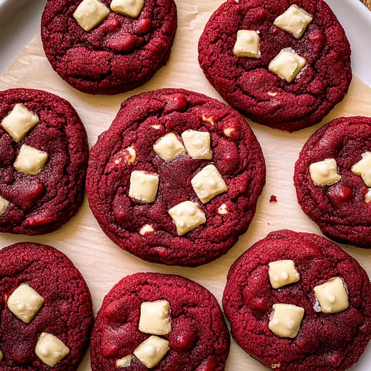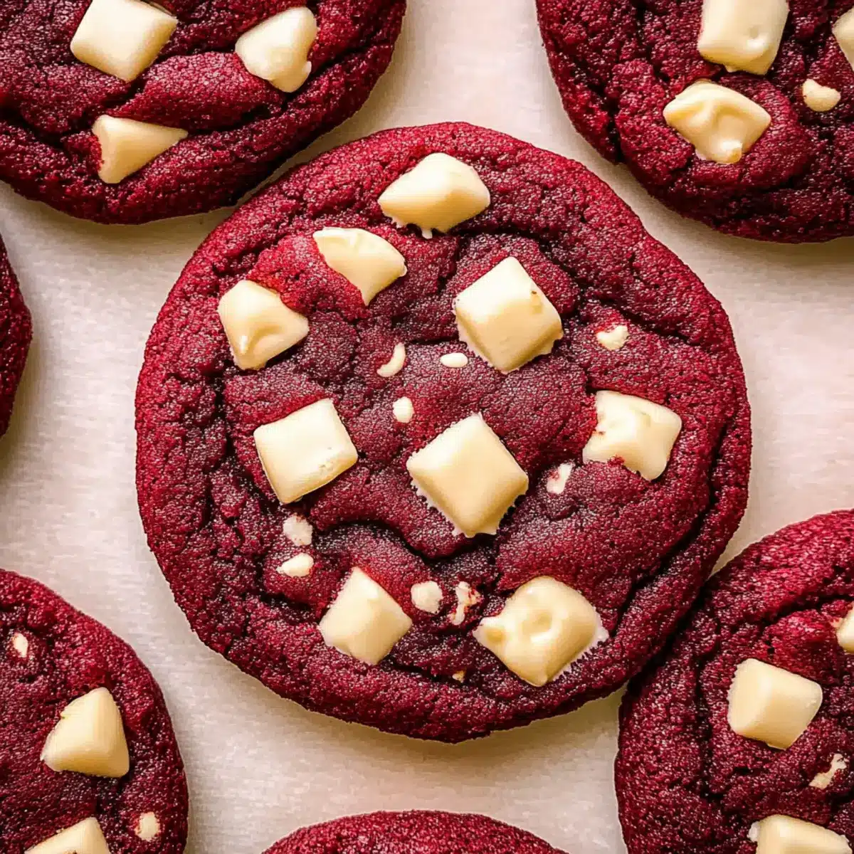 As I unwrapped the little gem of a cookie from its parchment paper, the deep crimson hue instantly lifted my spirits. These Chewy Red Velvet Cookies with White Chocolate Chunks are not just a feast for the eyes; they’re a delightful indulgence that melds rich cocoa flavors with the creamy sweetness of white chocolate. The beauty of this recipe lies in its simplicity—no chilling required, so you can create a batch in under 30 minutes! They’re perfect for any celebration, especially Valentine’s Day, as they carry a warmth that transforms ordinary moments into something special. Whether you’re a seasoned home chef or just starting out, these cookies cater to every level of expertise. With their soft, chewy centers and crisp edges, who could resist? Are you ready to let your oven work its magic and treat yourself (and maybe someone special) to these heavenly cookies?