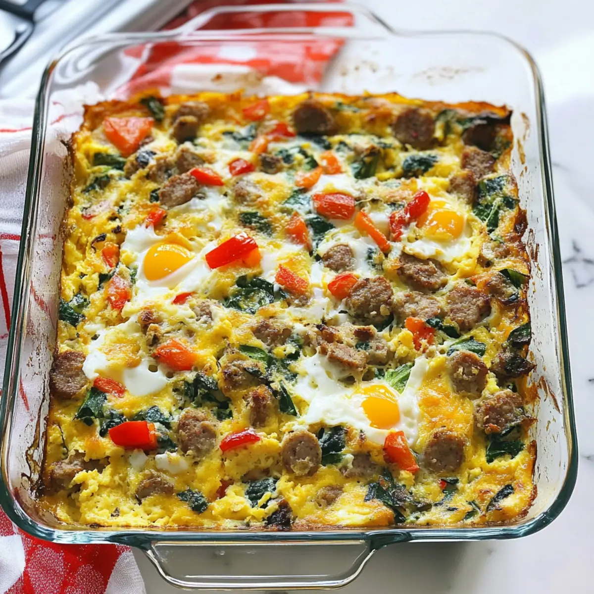Grease a 9×13 casserole dish with a bit of olive oil to prevent sticking. Pour the sausage and vegetable mixture evenly into the dish, spreading it across the bottom. This base layer will create a delicious foundation for your egg mixture to shine.