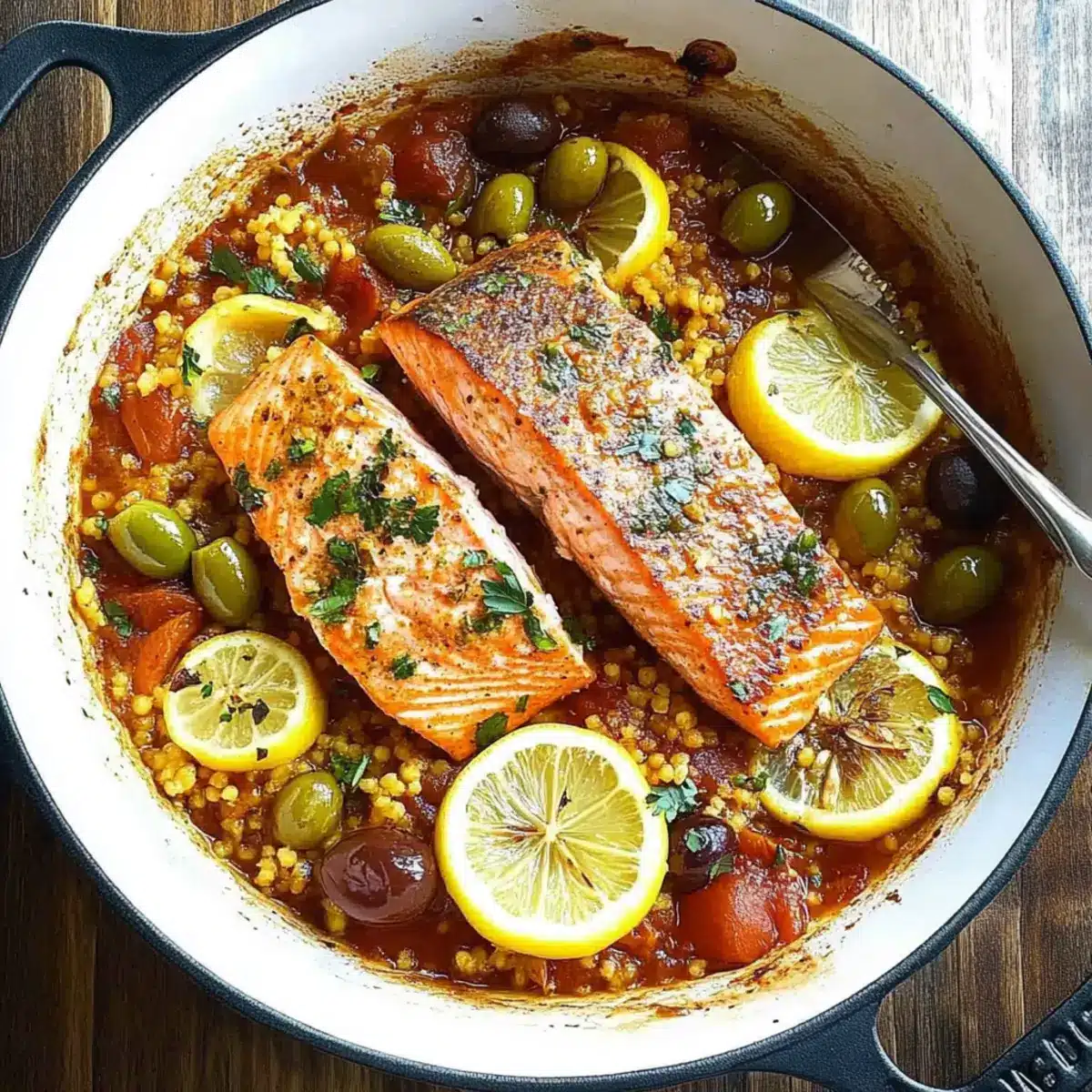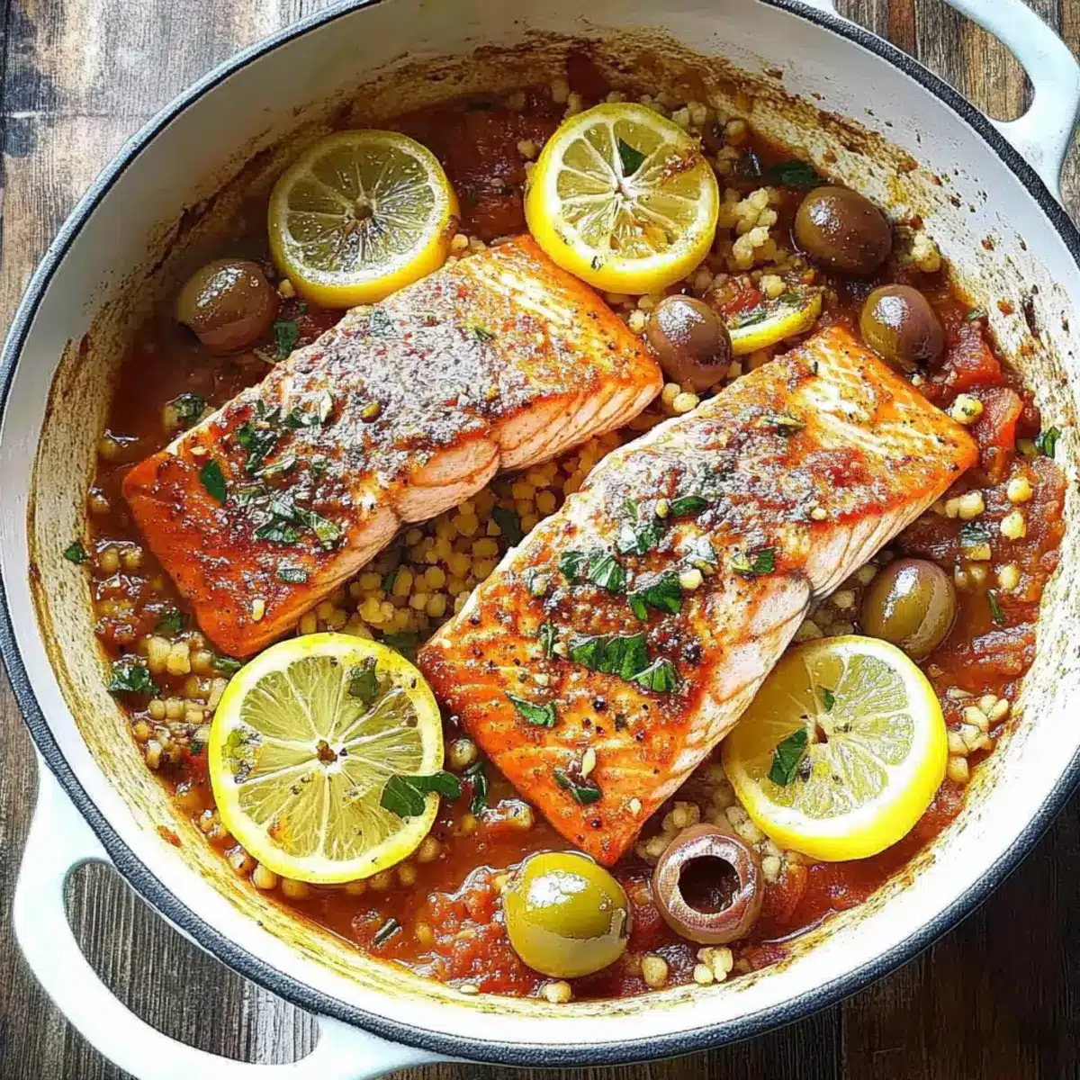 - To serve, spoon the couscous onto plates, top with salmon, drizzle sauce, and garnish with lemon slices and olives.