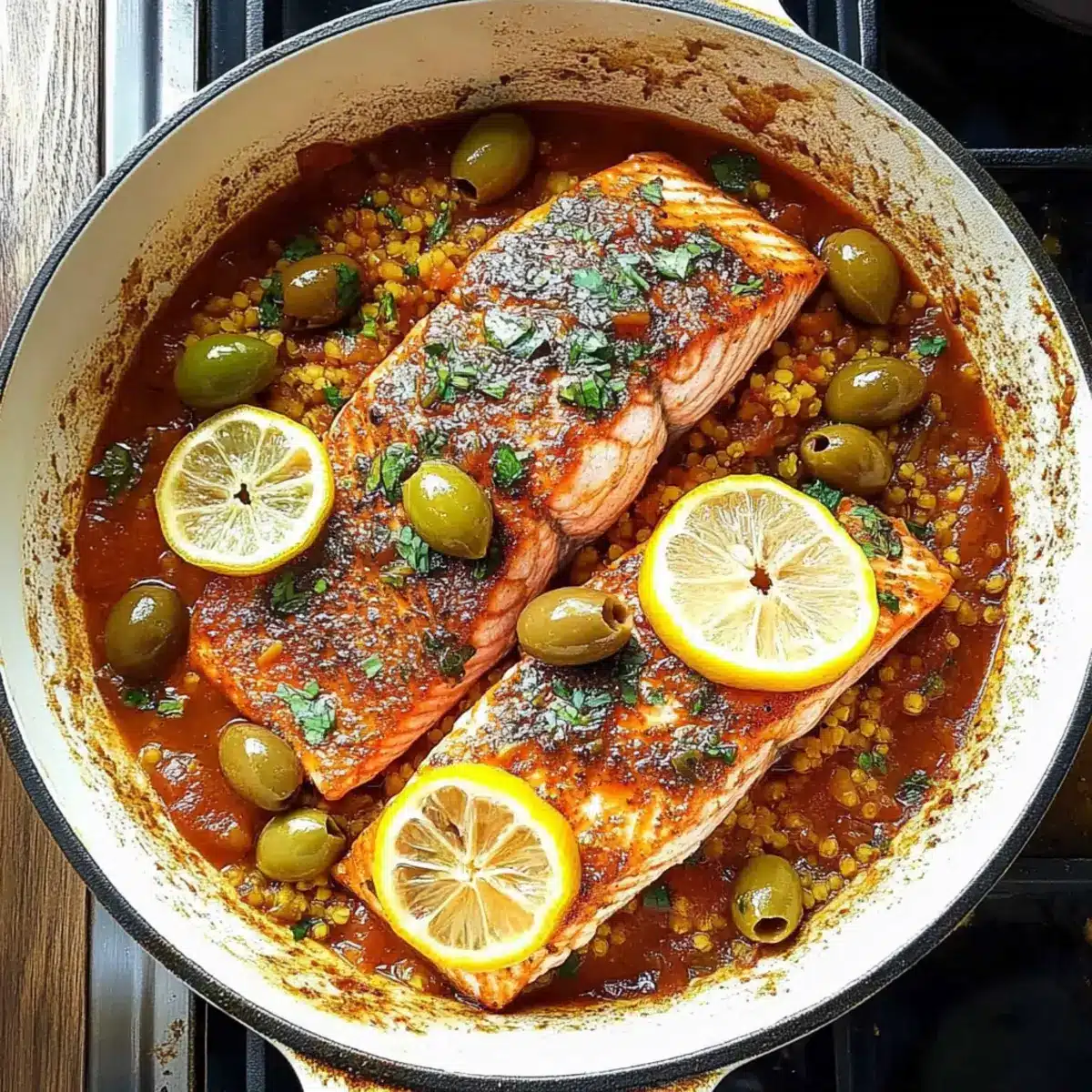 Carefully place the seared salmon fillets back into the skillet, along with the caramelized lemon slices and Castelvetrano olives. Cook everything together for an additional 2-3 minutes on low heat to ensure the salmon is heated through and infused with the rich flavors of the sauce.