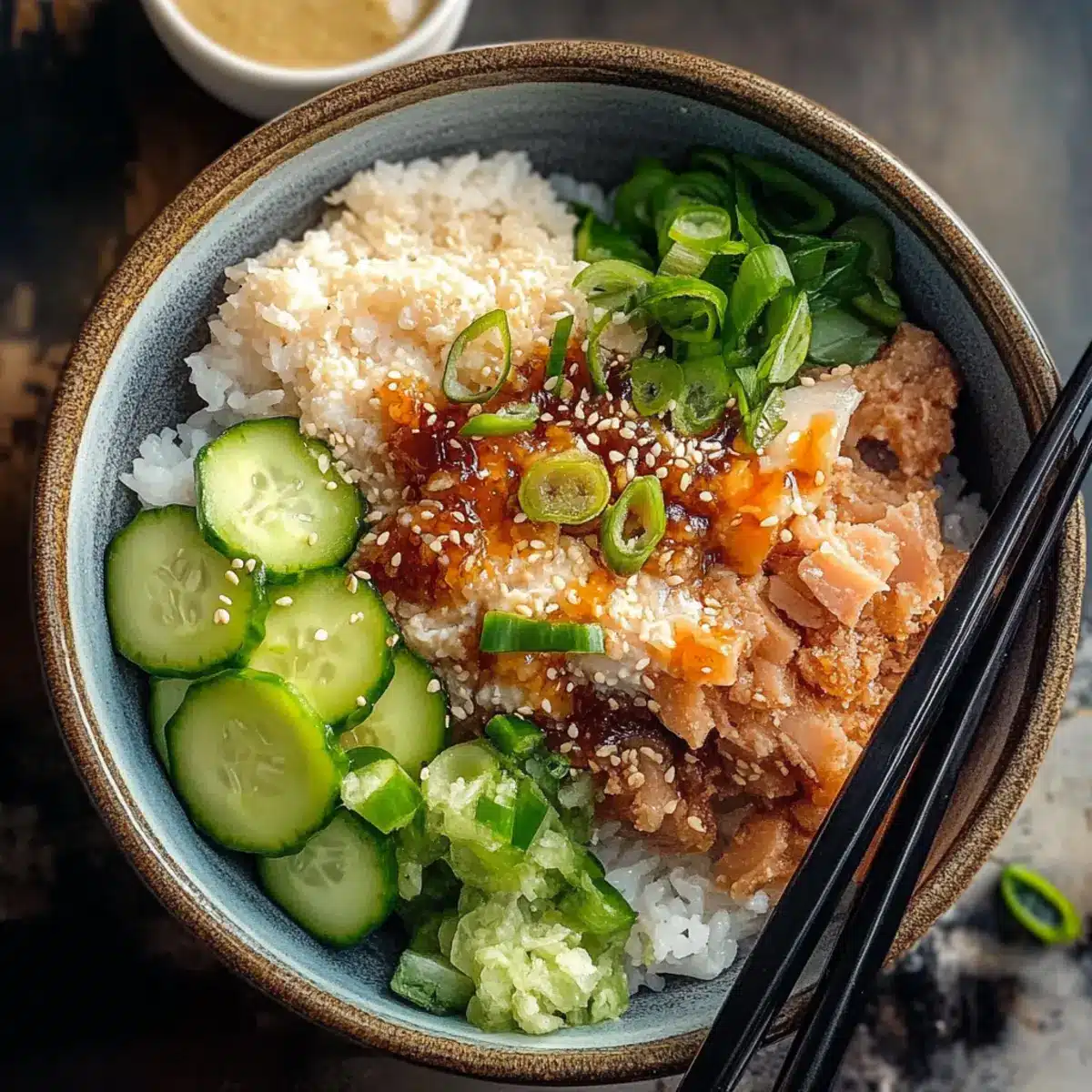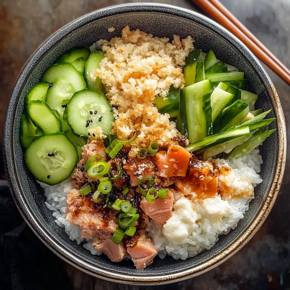 Spoon a generous portion of the spicy tuna mixture atop each crispy rice base. The rich tuna should beautifully contrast the crunch underneath. Next, slice fresh cucumber and scallions, and sprinkle them over the tuna. Feel free to get creative—add optional toppings such as sesame seeds, chili crisp, or crispy nori sheets to elevate your delicious Spicy Tuna Sushi Bowl even further.
