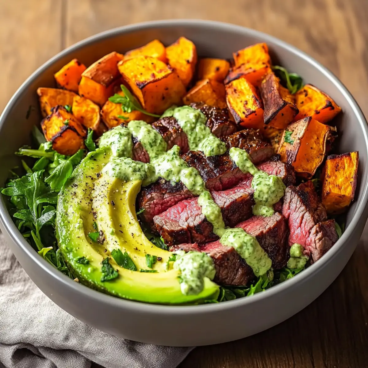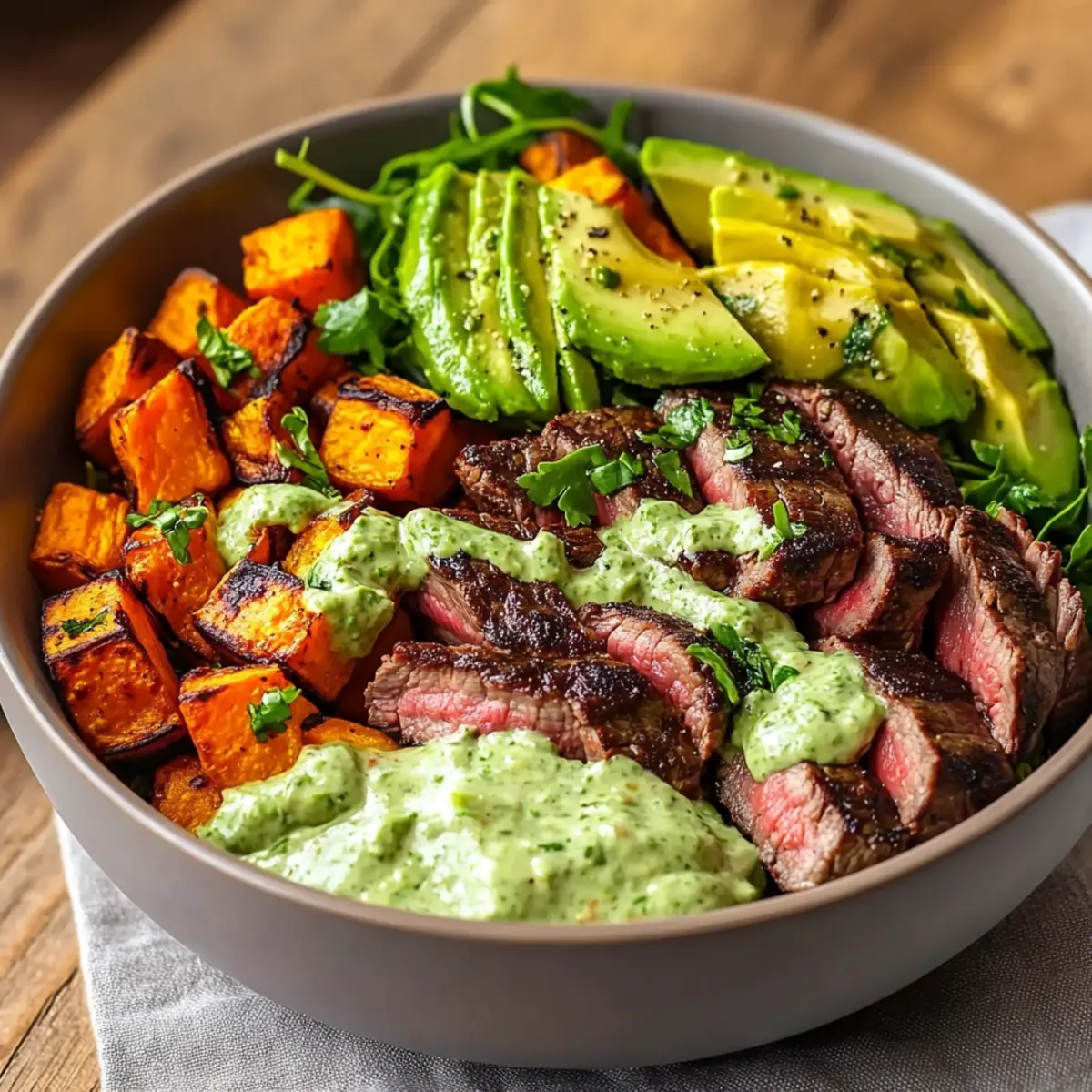 Steak and Sweet Potato Bowls with Creamy Avocado Drizzle