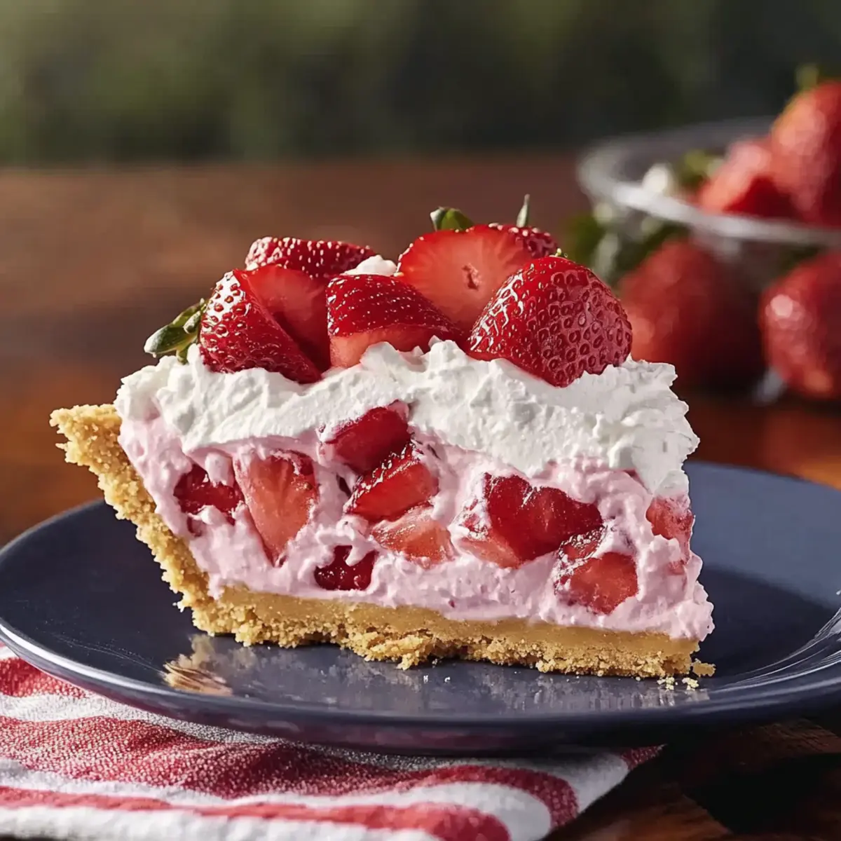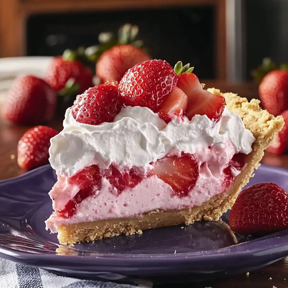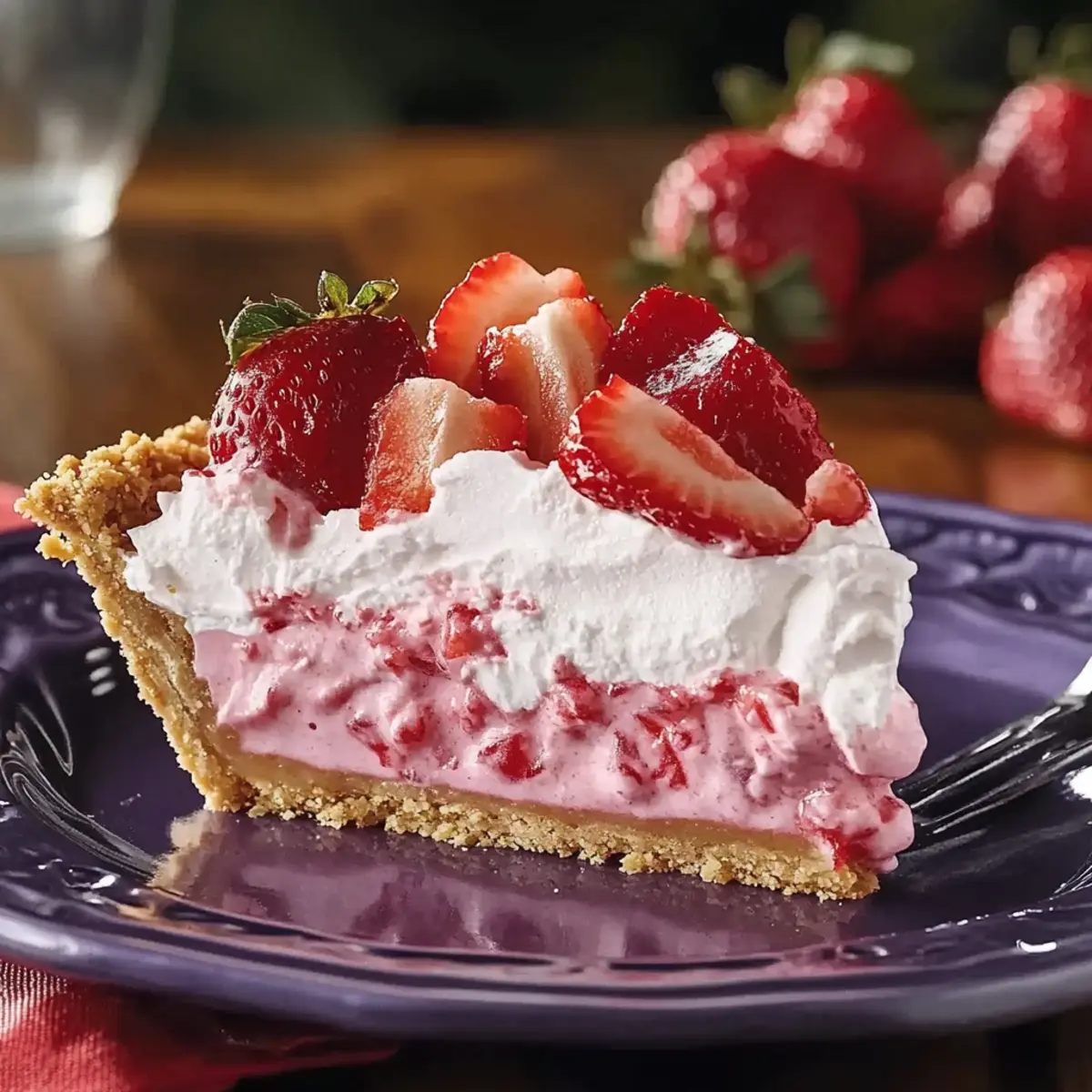 - Slice the pie into wedges and serve cold, garnishing with additional strawberries or Cool Whip if desired.