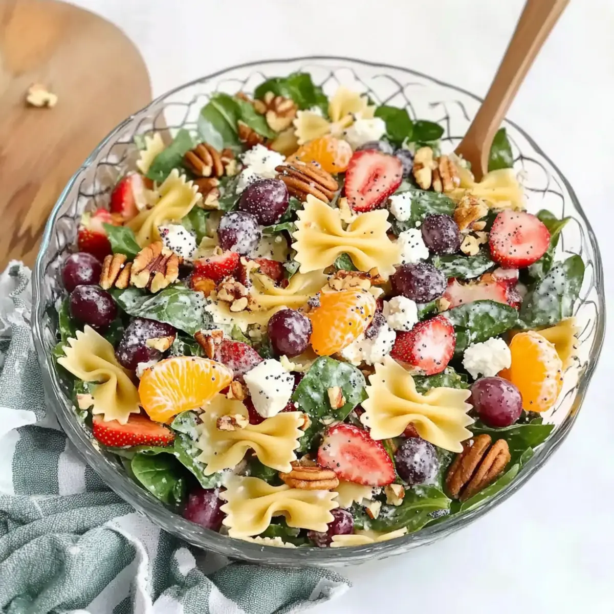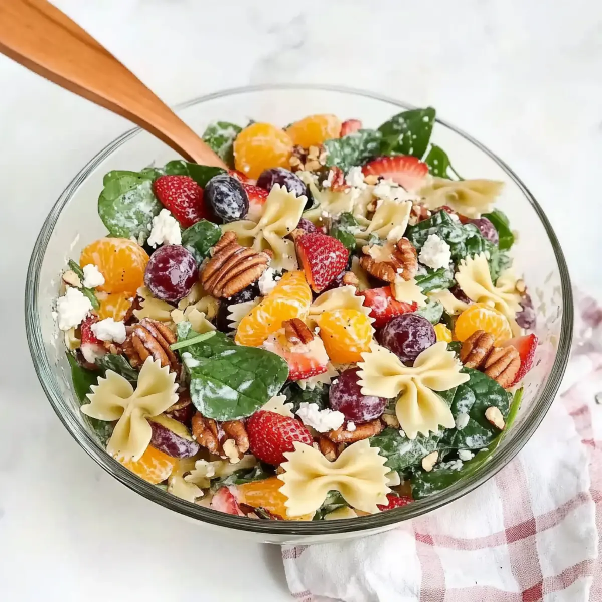 - In a mixing bowl, combine the cooled pasta with strawberries, grapes, spinach, red onion, and mandarin oranges. Fold gently to mix.