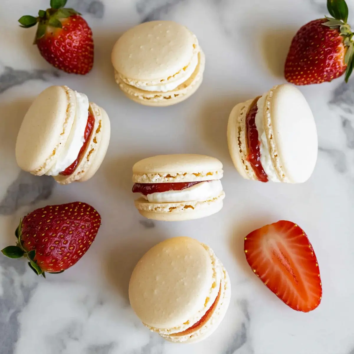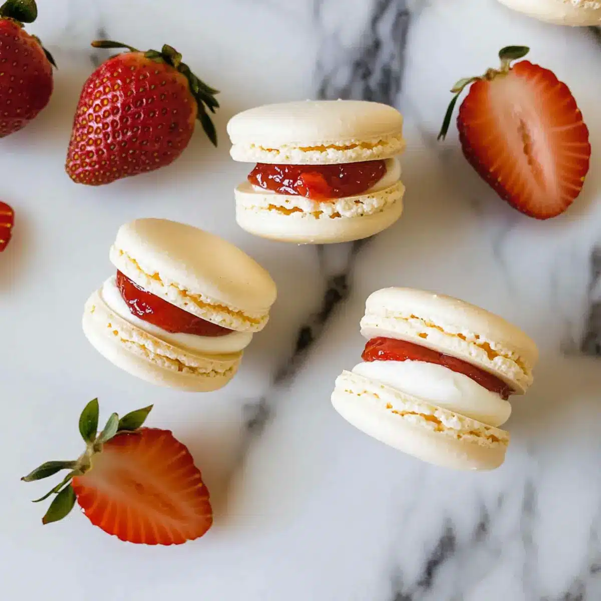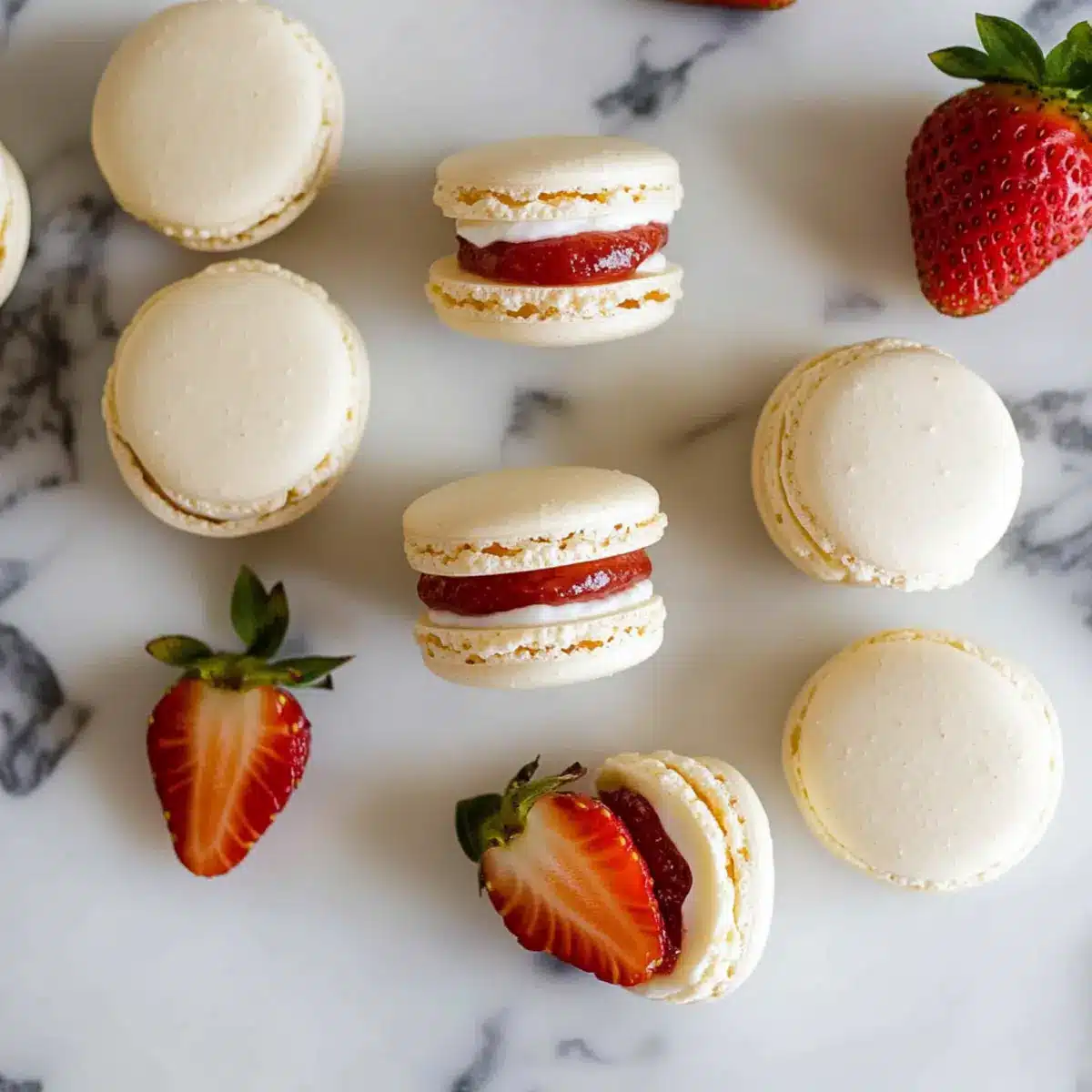 - Assemble: Pair macaron shells, pipe cream filling on one, add strawberry jam and fresh strawberry slice, then top with another shell.
