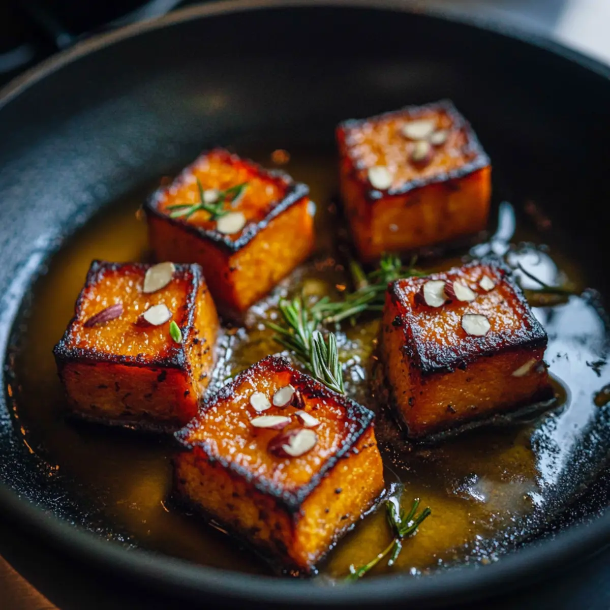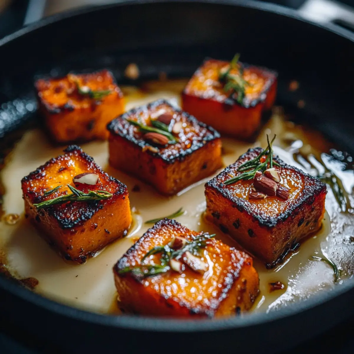 Cut the sweet potatoes into thick squares, ensuring even sizes for consistent cooking. In a large sauté pan, melt 2 tablespoons of butter with 1 tablespoon of olive oil over medium heat. Add the sweet potatoes and sear for 5 minutes until they turn a lovely golden brown. Gently shake the pan occasionally to prevent sticking, creating a beautifully caramelized exterior.