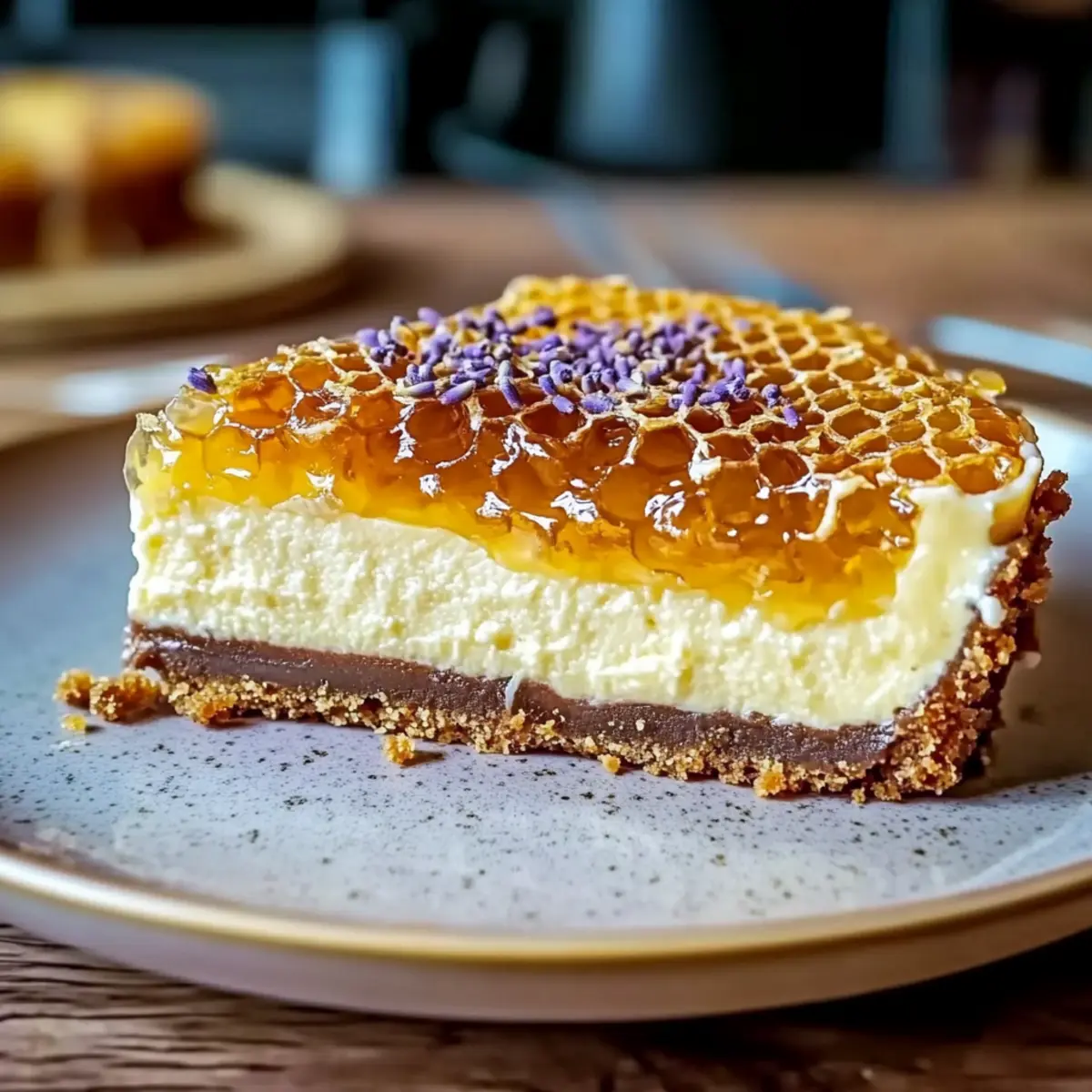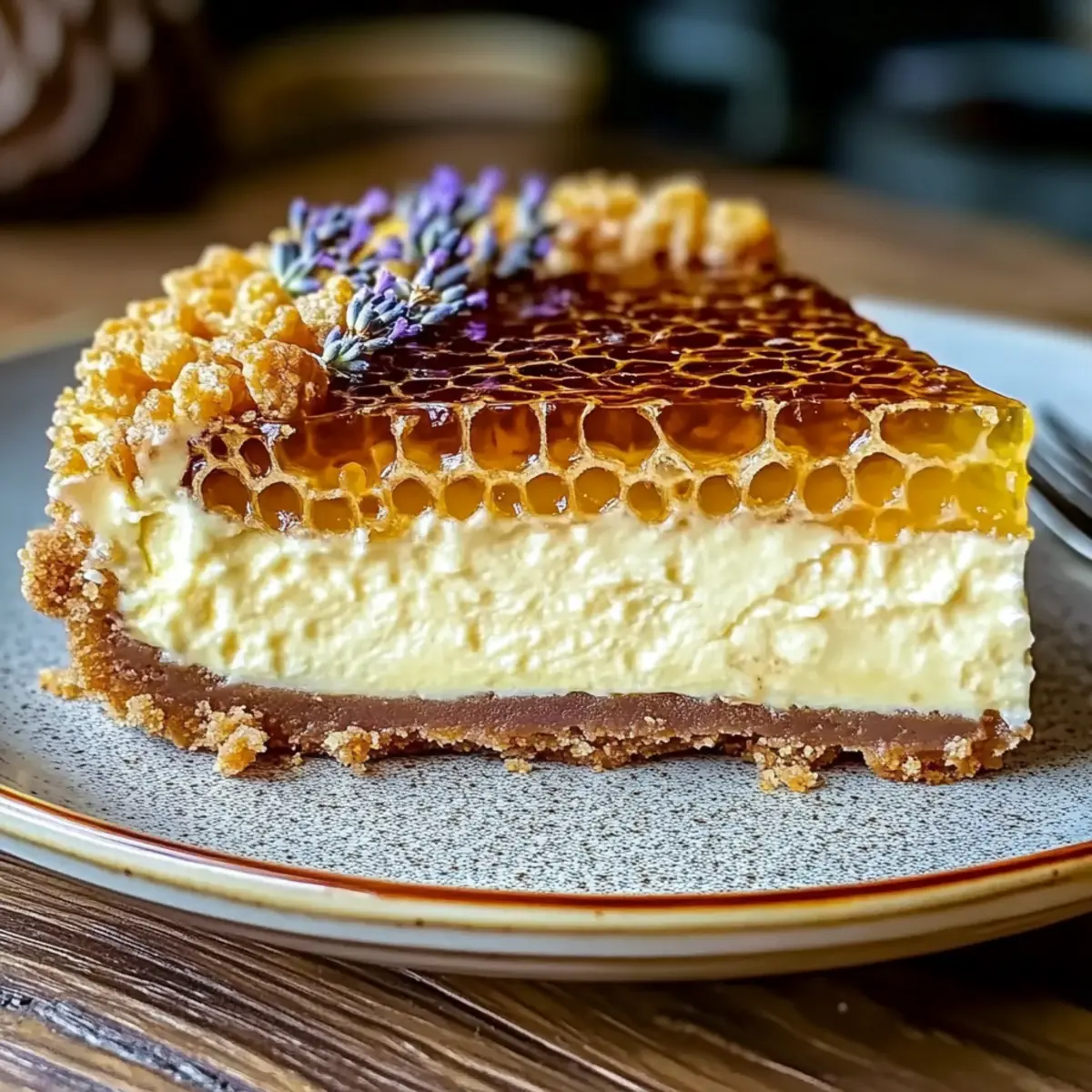 Honey Drizzle: A simple drizzle of honey accentuates the honeycomb topping and adds a delightful touch of sweetness, harmonizing beautifully with the tangy and aromatic elements of the dessert.