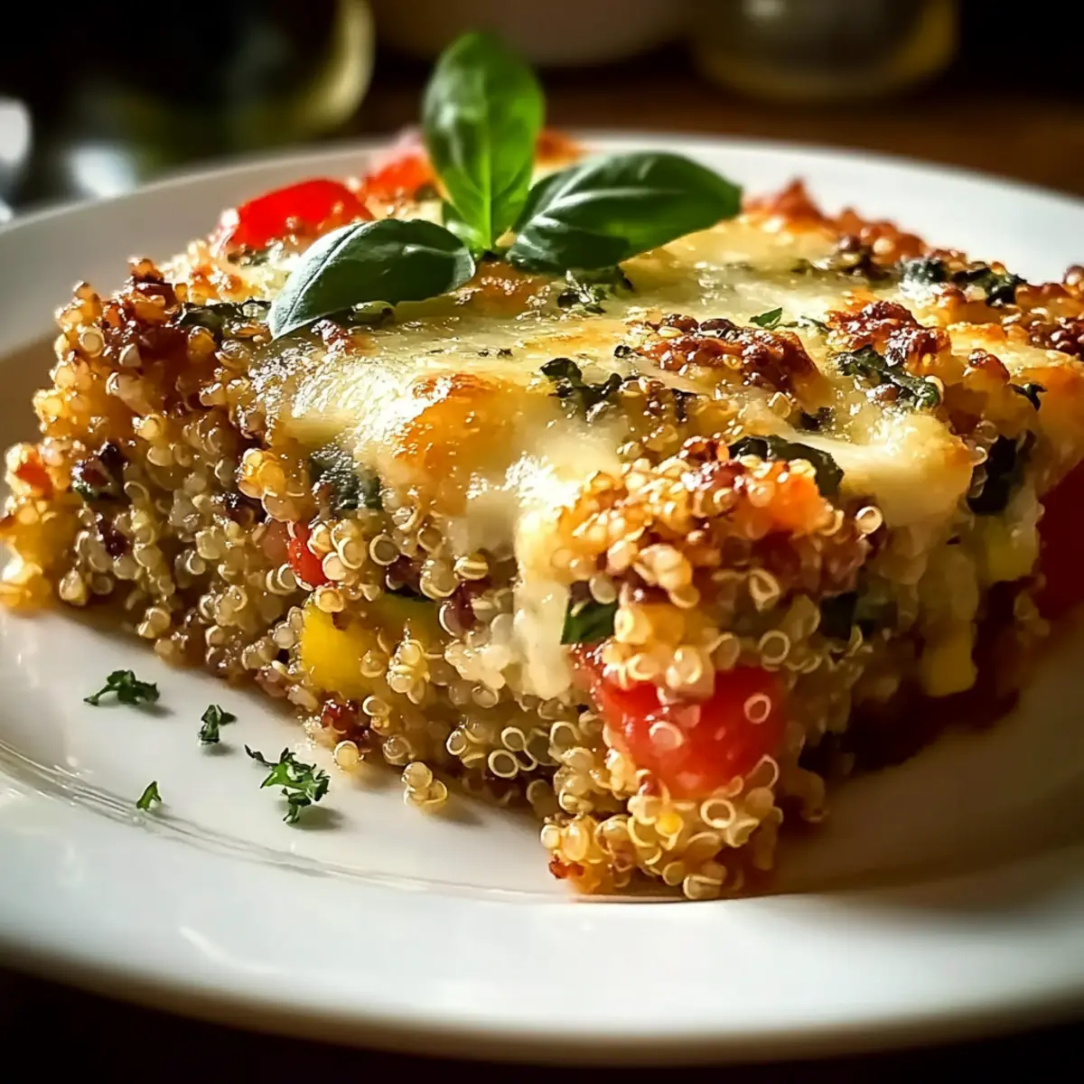 Grease a 9×13 baking dish, then pour the quinoa and veggie mixture into it, spreading it out evenly. Sprinkle 1 cup of shredded mozzarella and 1/2 cup of grated Parmesan cheese over the top, giving your casserole a luscious, cheesy finish.
